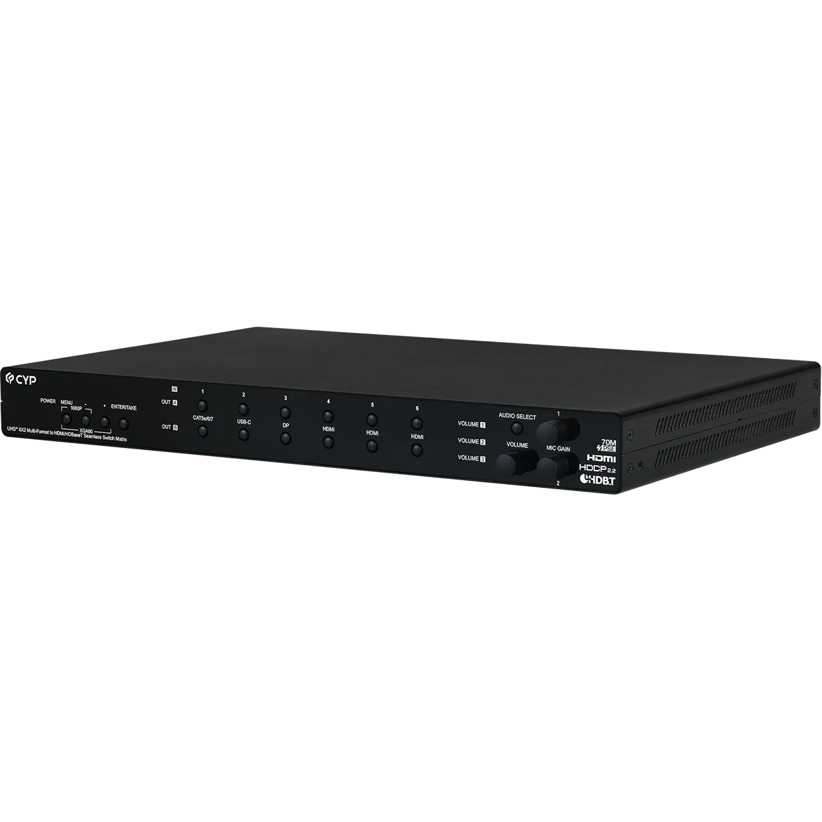 This 6 by 2 Matrix is a multi-format switcher with integrated scaling featuring HDMI, DisplayPort, USB Type-C, and HDBaseT. The selected source (video & audio) can be transmitted over Cat.6A cable up to 100 meters along with bi-directional Ethernet, RS-232, USB, and IR as well as providing 48V PoH power to compatible HDBaseT transmitter and receiver. The HDMI, DisplayPort and USB-C ports support resolutions up to 4K@60 (4:4:4, 8-bit) while the HDBaseT output supports automatic down-conversion of 4K60(4:4:4) sources to 4K60(4:2:0).