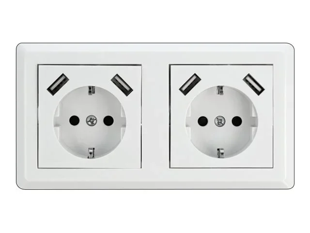 Diese Schutzkontakt-Steckdose von Delock dient dem Einbau in eine doppelte Unterputz- oder Hohlraumdose. Zusätzlich zu den zwei CEE 7/3 Steckdosen mit Kindersicherung bietet diese Schutzkontakt-Steckdose vier USB Typ-A Ladeports. Somit können Smartphones, Tablets und ähnliche Geräte geladen werden, während die Steckdosen weiterhin zur Verfügung stehen.