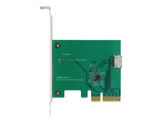 Diese PCI Express Karte von Delock erweitert den PC um einen SFF-8612 Anschluss. An diesen Port kann z. B. eine SSD, mit Hilfe eines optionalen Kabels, angeschlossen werden. Die Karte überträgt PCI Express Signale und verwendet dazu das NVMe Protokoll.