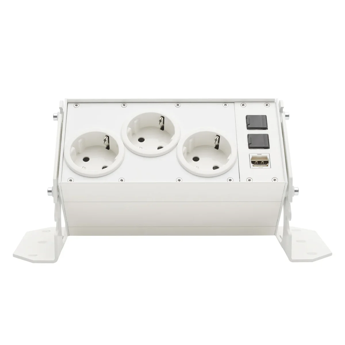 Unser SYSPORT Anschluss-System im Set LIGHT 1 lässt sich ohne Veränderung am Möbelstück verwenden und erlaubt Ihnen dank seiner Universalwinkel, die Montage in verschiedenen Ausrichtungen. So ist eine schräge, dem Nutzer zugeneigte Auftisch-Lösung ebenso einfach möglich, wie eine unsichtbare „hängende“ Installation unter der Tischplatte. Durch den modularen, fast unzerstörbaren mechanischen Aufbau ist jederzeit eine Nachrüstung oder eine Modifikation möglich. Das Gehäuse besteht aus einem stabilen Aluminium-Strangpressprofil, die Frontplatten, Seitenteile sowie Winkel sind aus solidem 2,0mm bis 2,5mm Stahlblech hergestellt. Die robuste und hochwertige Pulveroberfläche ist in drei verschiedenen Standardfarben (RAL 7016, RAL 9006 sowie RAL 9010) verfügbar und sorgt für den perfekten Look. Wunschfarben auf Anfrage.