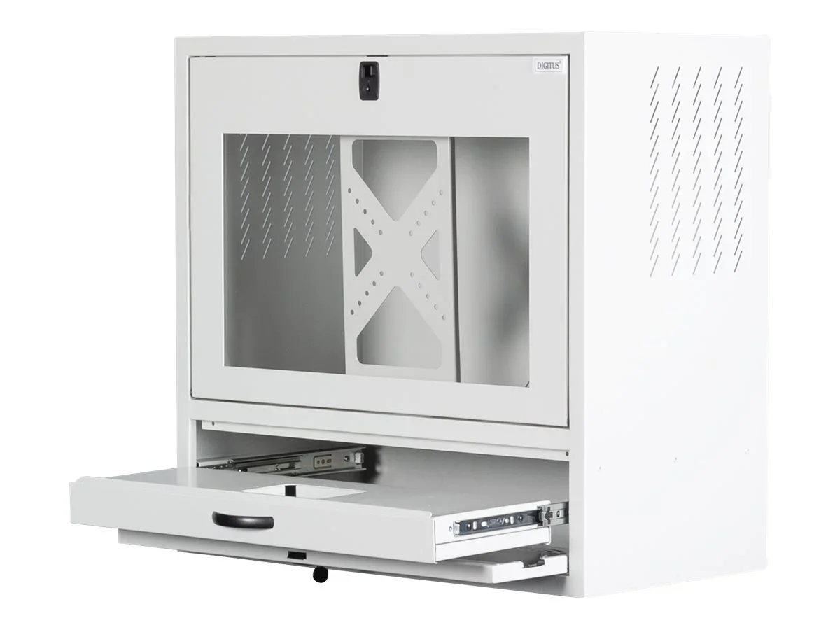 Die Arbeitsstation zur Wandmontage von DIGITUS wurde primär zur platzsparenden Nutzung in beispielsweise Büroumgebungen, Warenhäusern, Krankenhäusern, Laboratorien, Hotels oder Konferenzräumen hergestellt. Es ist in zwei Segmente unterteilt. Die obere Abteilung mit Glastür ist vorbereitet für die Montage eines Bildschirms mittels verstellbarer Halterung. Zusätzlich bietet das Gehäuse Platz zur Aufbewahrung Ihres Computers/Servers. Zur täglichen Nutzung und Aufbewahrung von Maus und Tastatur ist die zweite Abteilung ausgestattet mit einem ausziehbarem Fachboden. Die Unterseite ist ausgestattet mit Kabeleingängen sowie einer vorgestanzten Aufnahme für Lüfter.