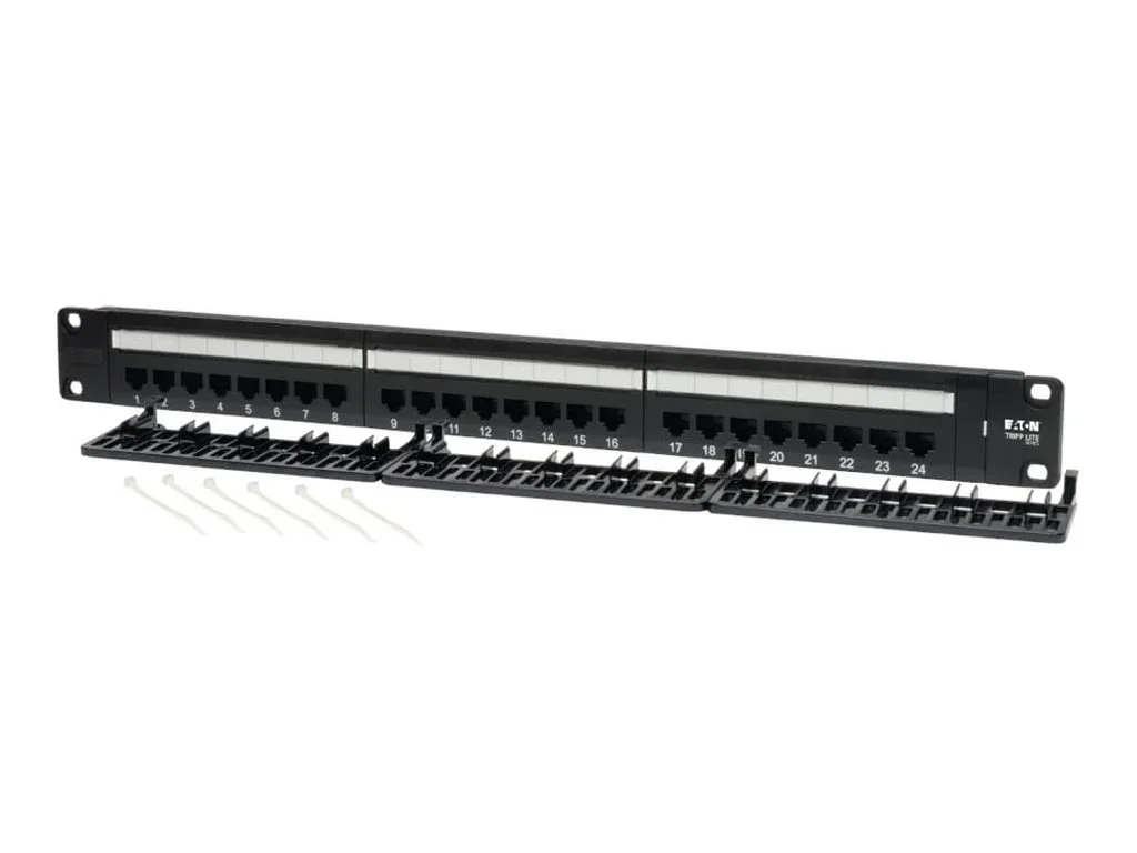 Das Eaton Tripp Lite Series 24-Port Cat5e Cat5 Rackmount Patch Panel ist für effiziente Netzwerkanwendungen konzipiert. Mit 24 Anschlüssen mit 110er-Typ-Terminierung gewährleistet dieses Patchpanel zuverlässige Konnektivität für Ihre CAT 5e-Verkabelungsanforderungen. Sein kompaktes Design passt in standardmäßige 19-Zoll-Racks mit einer Höhe von nur 1 Rack-Einheit, was es zu einer idealen Lösung für Umgebungen mit eingeschränktem Platzangebot macht.