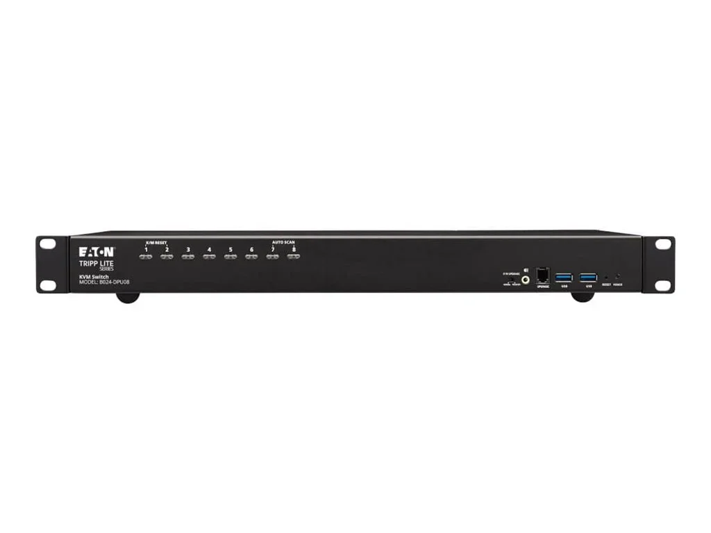 Der DisplayPort/USB-KVM-Switch mit 8 Anschlüssen, Audio/Video und USB-Peripheriefreigabe von Eaton Tripp Lite bietet eine vielseitige Lösung für die effiziente Verwaltung mehrerer Geräte. Mit Unterstützung für Videoauflösungen von bis zu 4096 x 2160 bei einer Bildwiederholfrequenz von 60 Hz sorgt dieser KVM-Switch für eine hohe Bildqualität aller angeschlossenen Geräte. Er verfügt über eine Reihe von Schnittstellen, darunter USB 3.0, Audio und DisplayPort, und ist damit eine ideale Wahl für private und professionelle Umgebungen. Das mitgelieferte Rack-Montage-Kit erhöht seine Anpassungsfähigkeit, so dass er sich nahtlos in eine Vielzahl von Installationen einfügt. Dieser KVM-Switch wurde für eine einfache Nutzung entwickelt und ermöglicht es einem lokalen Benutzer, alle angeschlossenen Geräte zu steuern, während er gleichzeitig eine bequeme gemeinsame Nutzung von Audio- und USB-Peripheriegeräten bietet. Er arbeitet in einem breiten Temperaturbereich und behält seine Funktionalität bei einer Luftfeuchtigkeit von 0 bis 80 % bei, was seine Zuverlässigkeit unter verschiedenen Bedingungen unterstreicht. Der KVM-Switch von Eaton Tripp Lite erfüllt verschiedene Normen, darunter UL und RoHS, und bietet Funktionalität und Sicherheit.