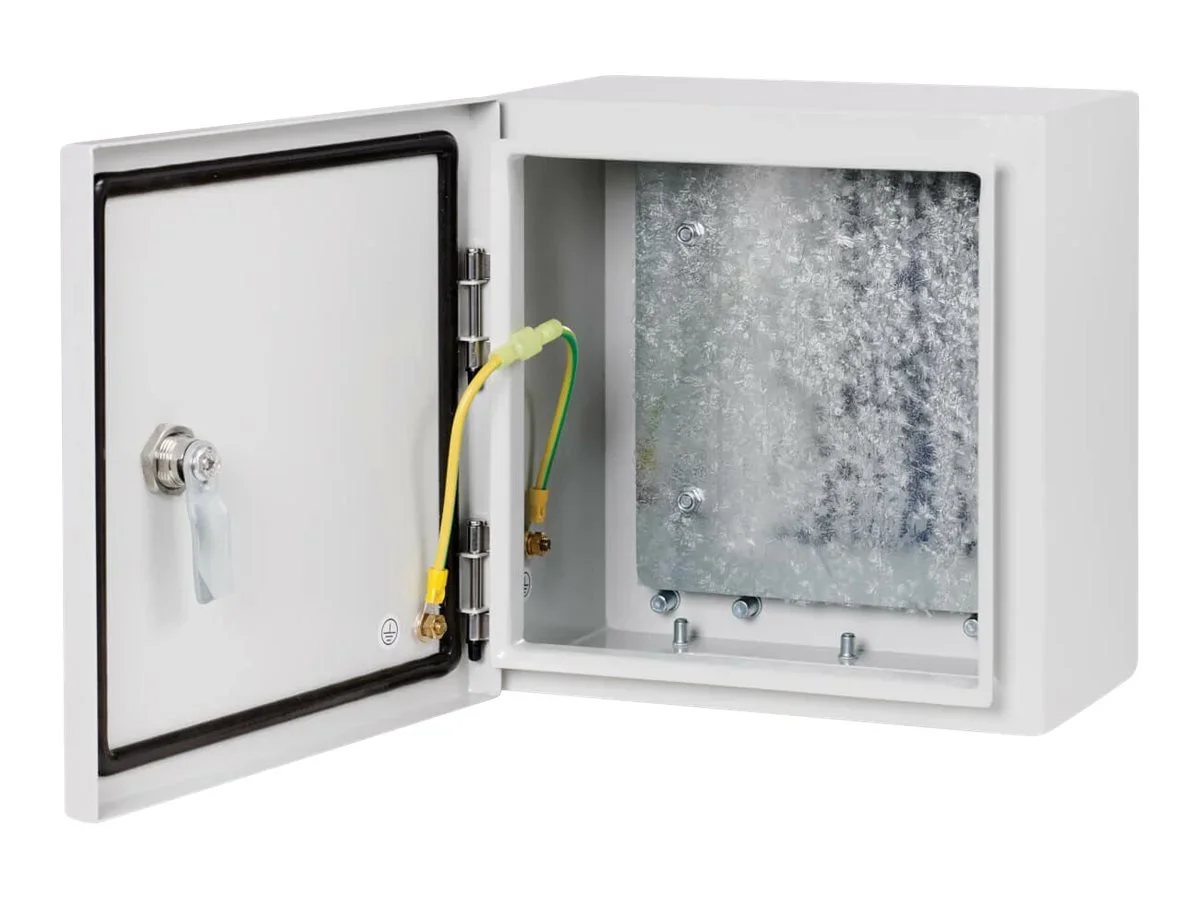 Der Schrank kann an der Wand montiert werden und wird mit dem notwendigen Installationszubehör geliefert, darunter ein Schlüssel, eine Installationsanleitung, M6-Schrauben und Montagehalterungen. Dieses Außengehäuse entspricht den Normen NEMA 4, UL 508A und RoHS und erfüllt die strengen Anforderungen des Außeneinsatzes und bietet Schutz vor Feuchtigkeit, was es zur idealen Wahl für anspruchsvolle Umgebungen macht. Das durchdachte Design umfasst eine abgedichtete Tür, um den Schutz vor Staub und Feuchtigkeit zu verbessern.