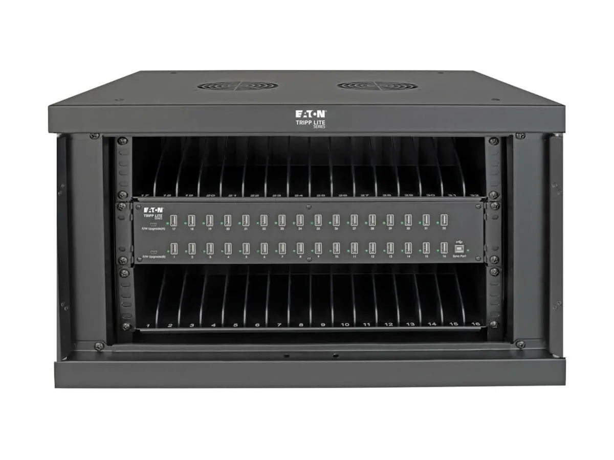 Eaton Tripp Lite Series 32-Device USB Charging Station Cabinet with Sync for Smartphones, Wall Mount and Desktop Options, 230V, BS1363 to C13 Plug, Black - Multigeräte-Ladegerät Netzwerkschrank - mit Schutzschalter - Desktop, geeignet für Wandmontage - Schwarz