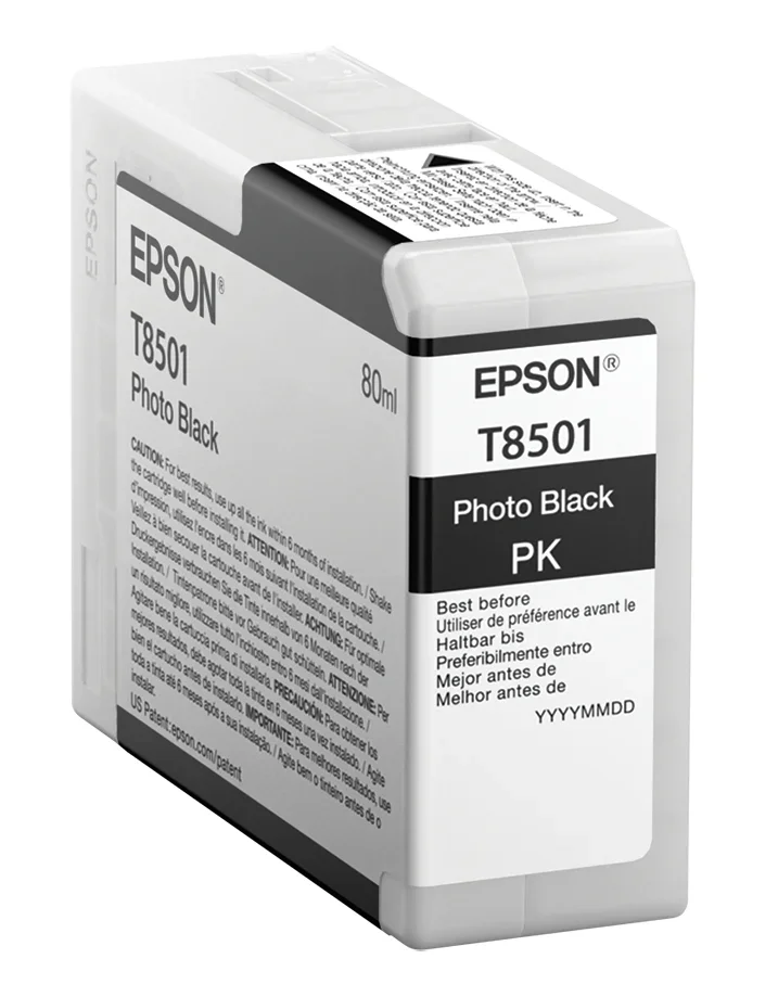 Epson T8501 Photo Black. Typ: Original, Tintentyp: Tinte auf Pigmentbasis, Druckfarben: Schwarz. Verpackungsbreite: 80 mm, Verpackungstiefe: 100 mm, Verpackungshöhe: 35 mm. Palettenbreite: 80 cm, Palettenlänge: 120 cm, Palettenhöhe: 180 cm