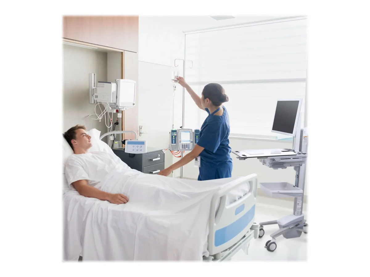 Dieser innovative und einfach zu manövrierende Wagen für den Einsatz in medizinischen Einrichtungen verfügt über eine Steh-Sitz-Höhenverstellung, unabhängige Bildschirmpositionierung und eine größere Arbeitsfläche mit Platz für Tastatur und Maus, ohne Bedarf an zusätzlichen Ablagen.
