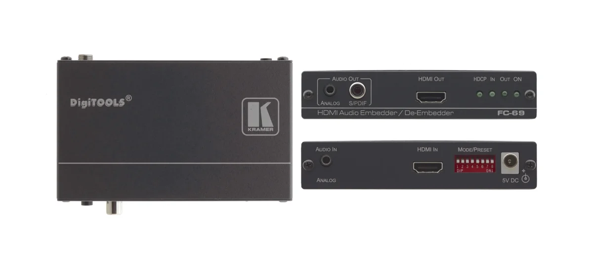 FC−69 ist ein Hochleistungs HDMI Audio Ein− und Auskoppler für 4K @60 UHD (4:2:0) und 4Kx2K. Das Gerät koppelt Analogaudio in den HDMI−Ausgang ein oder koppelt Audio aus dem HDMI−Eingang oder aus dem Audio−Rückkanal aus mit gleichzeitiger Wandlung in S/PDIF und unsymmetrisches Stereo−Audio am Ausgang.