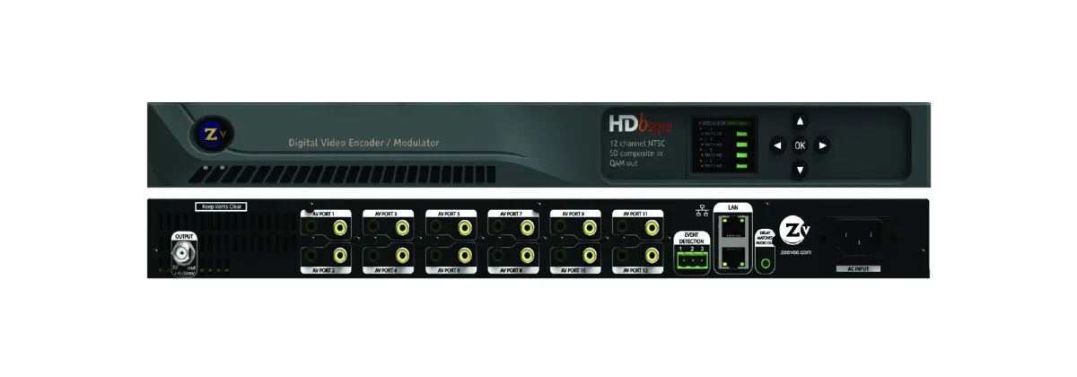 HDb2312−NA is an SD video encoder/QAM modulator with 12 composite video and analog 3.5mm audio inputs. MPEG−2 QAM RF output via 12 digital channels using 4 QAM RF frequencies. One delay matched analog audio output. Supports Closed Captions. Rack ears and power cord included. No ZvShow.