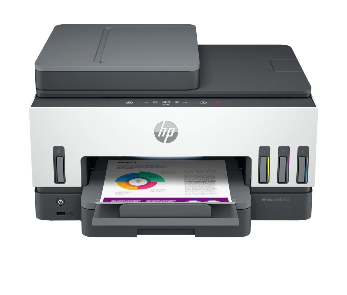 HP Smart Tank 7605 Wireless All-in-One Farbe Drucker, Beidseitiger Druck; Kopierer, Scanner. Drucktechnologie: Thermal Inkjet, Drucken: Farbdruck, Maximale Auflösung: 4800 x 1200 DPI, Druckgeschwindigkeit (Farbe, normale Qualität, A4/US Letter): 9 Seiten pro Minute. Kopieren: Farbkopieren, Max. Auflösung: 600 x 600 DPI. Scannen: Farbscan, Optische Scan-Auflösung: 1200 x 1200 DPI. Faxen: Farbfaxen. Duplexfunktion: Faxen. Maximale Papiergröße der ISO A-Serie: A4. WLAN. Direktdruck. Produktfarbe: Grau