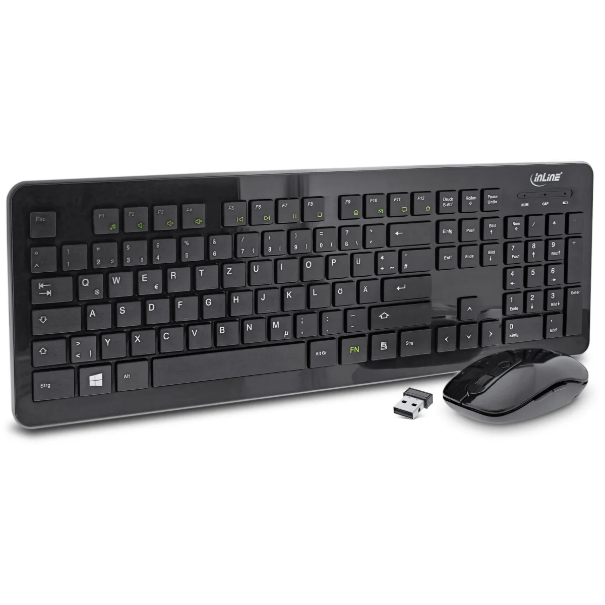 Das InLine® Design Desktop, Tastatur-Maus Set, ist ein Eingabegerät für Windows PC und Mac. Die Funktastatur, mit flachen Tasten, besitzt praktische Funktionstasten zum einfachen Ansteuern und Ausführen verschiedener Funktionen wie Lautstärke oder Navigationsfunktionen, die eine einfache und intuitive Navigation von Menü, Multimedia und Internet ermöglichen. Es zeichnet sich durch eine Hochglanz-Oberfläche und hochwertigem ABS-Material aus. Ferner weisen die Tasten eine raue Oberfläche, was eine Anti-Rutsch-Funktion ermöglicht. Die Design-Maus ist optisch, mit 5 Tasten, Scrollrad und einem DPI-Schalter (einstellbare Auflösung 800/1200/1600)