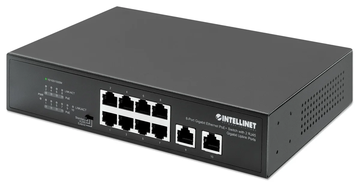INTELLINET 8-Port Gigabit Ethernet PoE+ Switch mit 2 RJ45 Gigabit Uplink-Ports IEEE 802.3at/af PoE+/PoE-konform 120W Endspan Desktop
