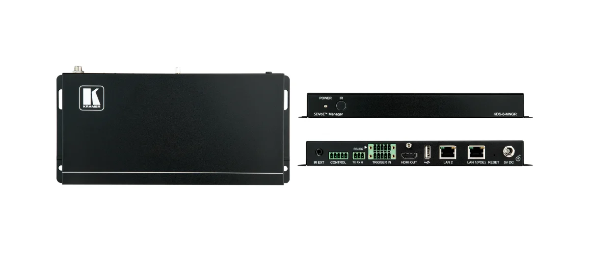 - Zentrale Steuerung — Ermöglicht die Steuerung und Konfiguration von kompatiblen KDS–8–Geräten über eine einzige Webseite. KDS–8–MNGR bietet unabhängiges Routen von Video–, Audio — und Steuerungssignalen sowie die Einstellung von Matrix–, Videowand — und Multiviewer–Modi.