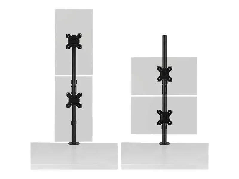 Der vertikale Dual Monitorarm bietet eine solide, stabile Anbringung von zwei Monitoren übereinander mit jeweils bis zu 32" (9 kg) und maximiert gleichzeitig die Arbeitsfläche. Ideal für Gaming. das Web-Browsing von oben nach unten, Kontrollräume oder überall dort, wo der Platz auf dem Schreibtisch begrenzt ist. Ein Schnellspanngriff bietet ein reibungsloses und müheloses Einstellen der Höhe des Monitors. Das einfach zu installierende und zu verwendende Full-Motion-Design ermöglicht die Positionierung des Monitors in jede Richtung. Abnehmbare, um ±180° drehbare VESA 75/100-Platten und eine vorinstallierte C-Klemme (optionale Tüllenbefestigung im Lieferumfang enthalten) bieten eine leicht zu installierende, stabile und sichere Basis. Integriertes Kabelmanagement für weniger Kabelgewirr.
