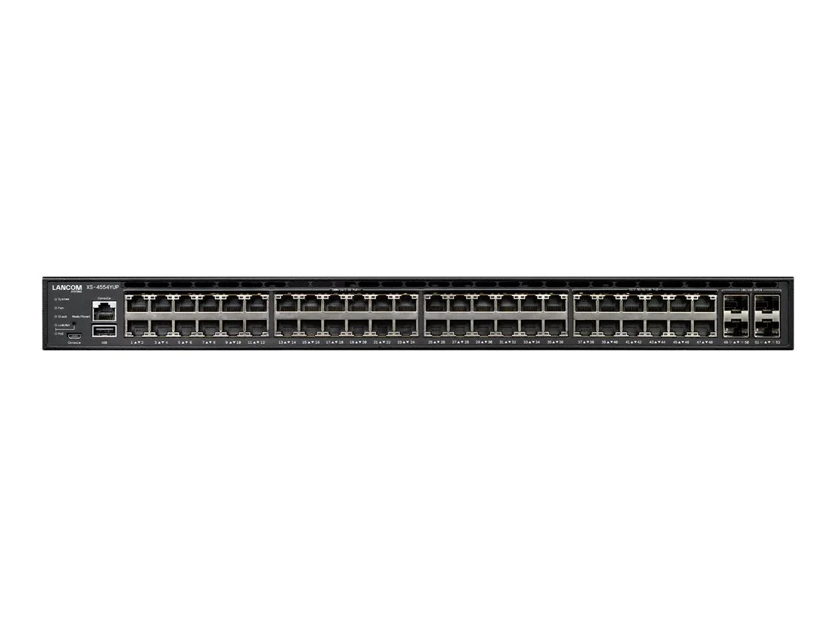 Der LANCOM XS-4554YUP ist ein Rack-Switch, der für hohe Netzwerk-Anforderungen entwickelt wurde. Mit einem Durchsatz von 1020 Gbps unterstützt er mehrere Hochgeschwindigkeitsprotokolle und eignet sich daher für Umgebungen, die ein robustes Datenmanagement und eine schnelle Konnektivität erfordern. Das Gerät verfügt über 54 Ports, darunter verschiedene Typen von 100/1000/2,5G bis 100 Gigabit, was Vielseitigkeit und Anpassungsfähigkeit an unterschiedliche Netzwerkanforderungen gewährleistet.