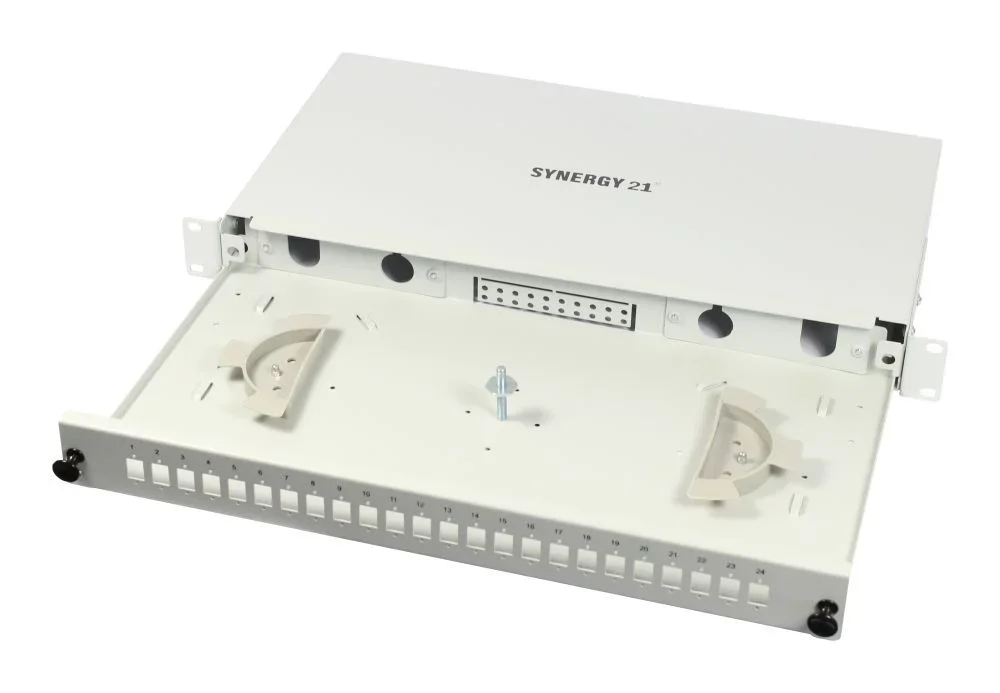 LWL-Patchpanel Spleisbox,19", 24xLSH(E2000APC)-Simplex-Buchsen, OS2, 9/125u Singlemode, incl.Pigtails, Lichtgrau, Synergy 21,
