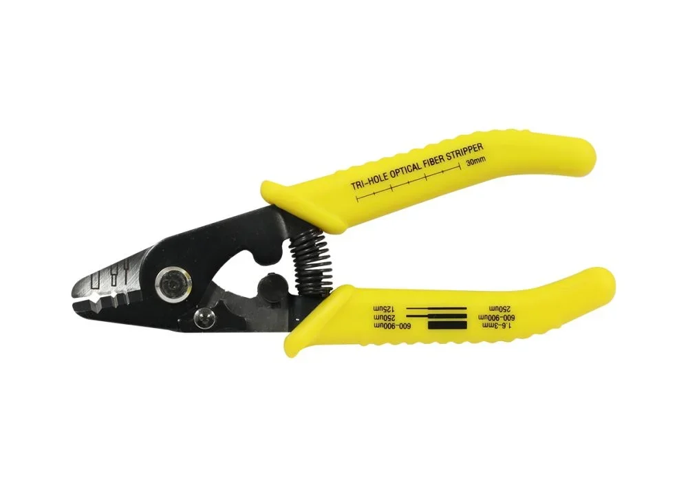 Absetzzange zum Entfernen desPrimär Coatings (250 µm auf 125 µm), Sekundär Coatings (900 µm auf 250 µm) und des 2-3 mm Außenmantels, mit Rückholfeder, mit Feststeller(Verriegelung),