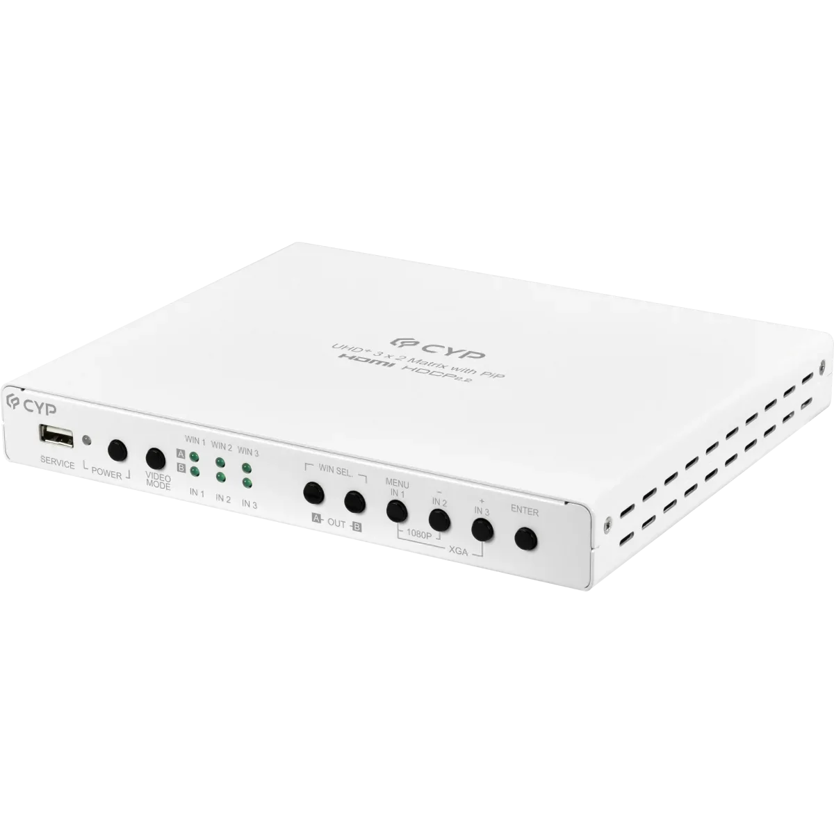 Supports SDI input distance up to 60 meters, HDMI input/output with 18Gbps (600MHz) 4K UHD, Seamless switching (no loss of sync to display) when switching sources in 3x2 matrix mode, Supports PiP (Picture-in-Picture), PoP, Side-by-Side and Auto display options with independent audio source selection, Supports the ability to store a multi-window arrangement as a preset that can be recalled later, Each window can have a border with a selectable color, EDID management, Uploadable and freely positioned graphic logo support, Supports easy adjustment of window size, position and settings in the PiP windowing mode via the WebGUI, Controllable via front panel buttons, WebGUI, Telnet, RS-232
