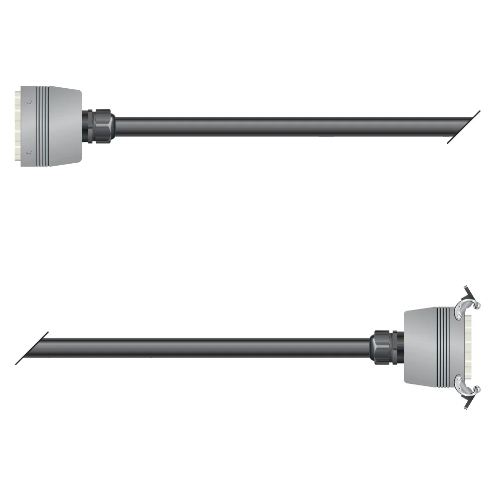 Wir verwenden unsere hochflexible Multipair-Leitung PLANET FMC mit einzelisolierten und geschirmten Adernpaaren. Als Steckverbinder setzen wir zwei Multipinbuchsen von ILME ohne Verriegelung ein, die kompatibel sind zu allen marktgängigen Rechteck-Verbindern (Harting usw.). Die Multipin-Buchsen sind sowohl in gerader als auch in abgewinkelter Bauform erhältlich. Unsere Standard-Belegung, die wir für die zentrale Masseführung zu Grunde legen, finden Sie unter www.sommercable.com/support.