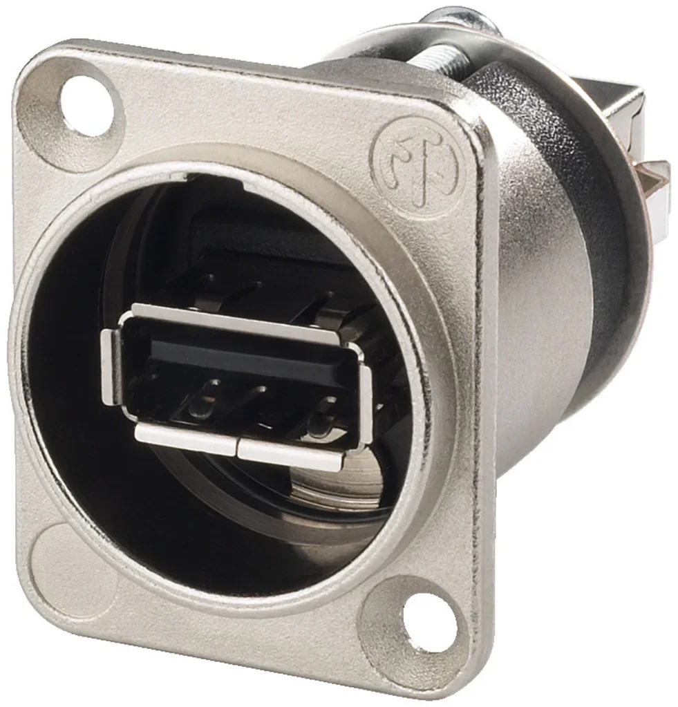 USB-Durchgangs-Einbaubuchse, vernickelt, zur Integration von computergestützten Geräten in Ton- und Videosystemen sowie für Audio-Netzwerke wie M-LAN, Cobra Net etc.