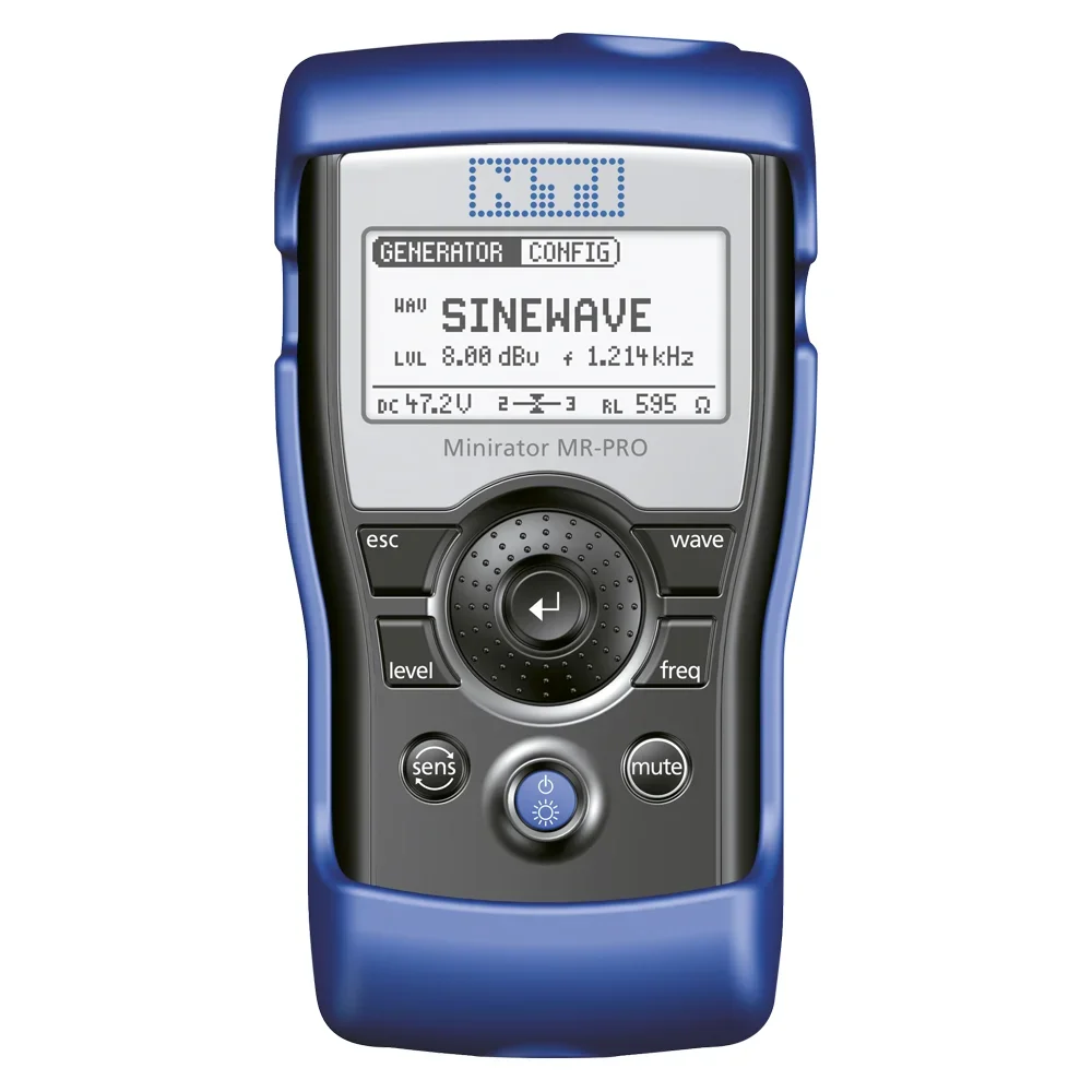 | Features/Daten | 3 x AA-Batterien (Betrieb: 10 h), Ausgangspegel –20 … +18 dBu, DC- & USB-Anschluss, Frequenzbereich: 10 Hz – 20 kHz, Laufzeit-Testsignal, Polaritätssignal, Quellimpedanz 12,5 Ω, Sinus- /Rechtecksignal bis 5 kHz, Sweep mit einstellbarer Dauer, THD+D –96 dB, XLR und Cinch Ausgang, weißes / rosa Rauschen |