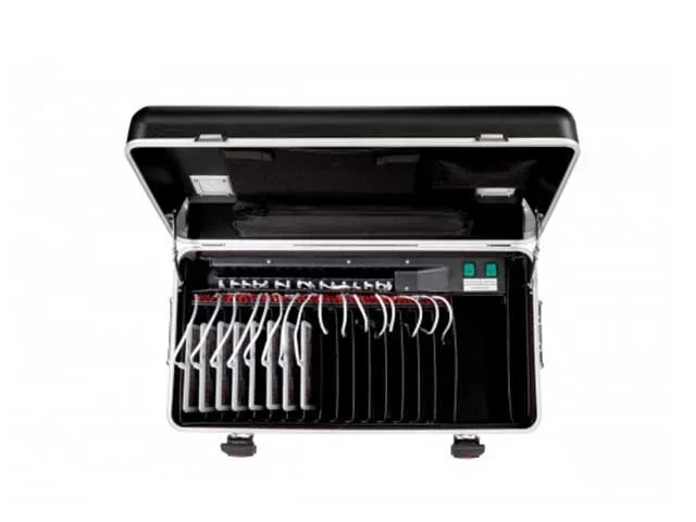 Als Lösung für iPad-Klassen und Schulungen hat sich der intelligente PARAPROJECT Case i16 etabliert. Der flexible Systemkoffer bietet in gepolsterten Fächern, Raum für bis zu 16 iPad, die er über die zentrale Lade- und Sync-Einheit in optimaler Geschwindigkeit lädt und synchronisiert. Seine in Reihe positionierten USB-Anschlüsse ermöglichen ein sauberes Kabelmanagement. Die praktische "Flex2Connect" Technik erlaubt es , Lade-,Sync-Kabel und Steckertypen auszutauschen oder zu kombinieren. Darüber hinaus stehen Anschlussmöglichkeiten für Zubehör wie Apple TV, AirPort und das MacBook bis 15.6" zur Verfügung. Seitlich montierte Griffe erleichtern das Tragen, Zahlenschlösser schützen vor unbefugtem Zugriff. Sein geringes Gewicht in Kombination mit dem 4-Rollen-Konzept „EasyMove" und dem bis zu einem Meter ausziehbaren Teleskopgriff machen das Handling des Koffers besonders angenehm. Die strapazierfähige schwarze Aussenhülle aus X-ABS Kunststoff im Aluminiumrahmen, schützt sicher vor äußeren Einwirkungen. So überzeugt der PARAPROJECT Case i16 neben der ausgeklügelten Funktionalität mit ansprechendem Design und hochwertig verarbeiteter Materialien. Er ist kompatibel mit allen iPad Generationen ab 4 Air und mini. Im Lieferumfang enthalten sind die USB Lightning-Kabel.