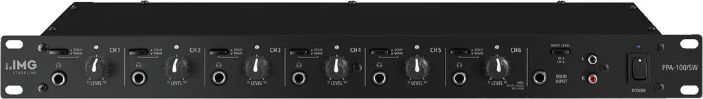 - Eingänge: Solo (stereo) 6 x 6,3-mm-Klinke, Main (stereo) 2 x 6,3-mm-Klinke, 2 x Cinch L/R