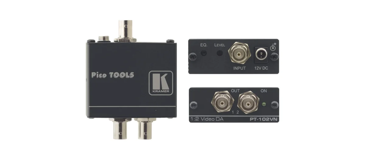 PT−102VN ist ein Composite− oder SDI−Video−Verteilverstärker. Er erhält ein Eingangssignal, entkoppelt und isoliert es und verteilt das Signal an zwei identische Ausgänge.