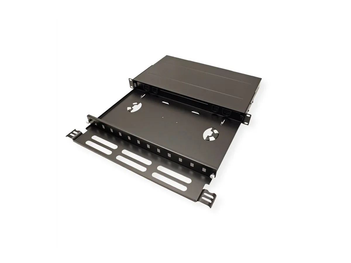Ausziehbares LWL 19"-Panel zur Aufteilung mehradriger LWL-Kabel auf Einzeladern Für Aufnahme von Spleißkassetten vorbereitet Stahlblech 1,5mm, schwarz Kabeleinführung: PG 13, 2 Kabelverschraubungen inklusive Platz für max. 12 Kupplungen SC-Simplex 21.17.0075/71 oder 12 Kupplungen LC-Duplex 21.17.0141 Zum Einsatz in 19" Serverschränken.