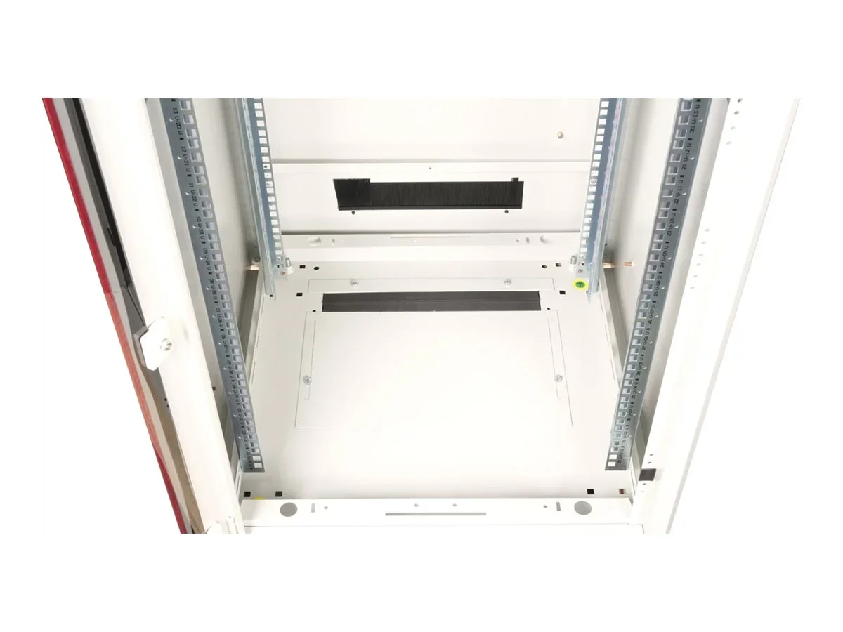 ROLINE 19 Zoll Netzwerkschrank Pro 32 HE 600x600 BxT Glastür grauDie Netzwerkschränke der ROLINE Pro Serie wurden entwickelt, um eine besonders komfortable und flexible Netzwerkverkabelung zu ermöglichen. Mit Bürsteneinlässen im Dach- und Bodenbereich (ab 26HE und 800 mm Schrankbreite), einem aufschiebbaren Einlass im Bodenchassis mit Moosgummidichtung sowie Bürstenleisten ober- und unterhalb der Rücktür (ab 26HE) bieten sie vielseitige Einsatzmöglichkeiten für verschiedene Anwendungsszenarien. Vertikale Kabelführungskanäle mit Blende, installiert neben den Profilschienen (ab 800 mm Schrankbreite), vervollständigen das Design. Ein abgesetzter, abnehmbarer Deckel mit Lüftungsschlitzen verbessert die Luftzirkulation und ermöglicht eine einfache Installation eines Lüftermoduls. Die Lüftereinheit kann von oben ein- und ausgebaut werden, ohne dass die Komponenten im Inneren betroffen sind. Im Inneren sind zwei Paar galvanisierte 19"-Profilschienen verbaut, die in beide Richtungen ablesbar und in der Tiefe verstellbar sind. Sie sind zudem mit zusätzlichen Tiefenstreben im Schrank verbunden. Jeder Schrank besteht aus einer robusten Stahlkonstruktion mit einer Materialstärke von bis zu 1,5 mm Stahlblech.Die Farbgebung erfolgt mittels elektrostatischer Pulverbeschichtung in den Standardfarben Grau (RAL 7035) und Schwarz (RAL 9005). Modular abnehmbare Seitenwände und Türen verbessern die Zugänglichkeit. Ein Wechsel des Türanschlags ist möglich. Die Schränke sind bei Bedarf auch vollständig zerlegbar.