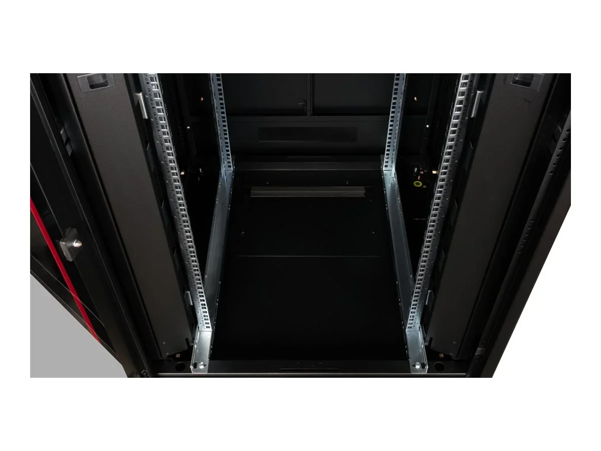ROLINE 19 Zoll Netzwerkschrank Pro 32 HE 800x800 BxT Glastür schwarzDie Netzwerkschränke der ROLINE Pro Serie wurden entwickelt, um eine besonders komfortable und flexible Netzwerkverkabelung zu ermöglichen. Mit Bürsteneinlässen im Dach- und Bodenbereich (ab 26HE und 800 mm Schrankbreite), einem aufschiebbaren Einlass im Bodenchassis mit Moosgummidichtung sowie Bürstenleisten ober- und unterhalb der Rücktür (ab 26HE) bieten sie vielseitige Einsatzmöglichkeiten für verschiedene Anwendungsszenarien. Vertikale Kabelführungskanäle mit Blende, installiert neben den Profilschienen (ab 800 mm Schrankbreite), vervollständigen das Design. Ein abgesetzter, abnehmbarer Deckel mit Lüftungsschlitzen verbessert die Luftzirkulation und ermöglicht eine einfache Installation eines Lüftermoduls. Die Lüftereinheit kann von oben ein- und ausgebaut werden, ohne dass die Komponenten im Inneren betroffen sind. Im Inneren sind zwei Paar galvanisierte 19"-Profilschienen verbaut, die in beide Richtungen ablesbar und in der Tiefe verstellbar sind. Sie sind zudem mit zusätzlichen Tiefenstreben im Schrank verbunden. Jeder Schrank besteht aus einer robusten Stahlkonstruktion mit einer Materialstärke von bis zu 1,5 mm Stahlblech.Die Farbgebung erfolgt mittels elektrostatischer Pulverbeschichtung in den Standardfarben Grau (RAL 7035) und Schwarz (RAL 9005). Modular abnehmbare Seitenwände und Türen verbessern die Zugänglichkeit. Ein Wechsel des Türanschlags ist möglich. Die Schränke sind bei Bedarf auch vollständig zerlegbar.
