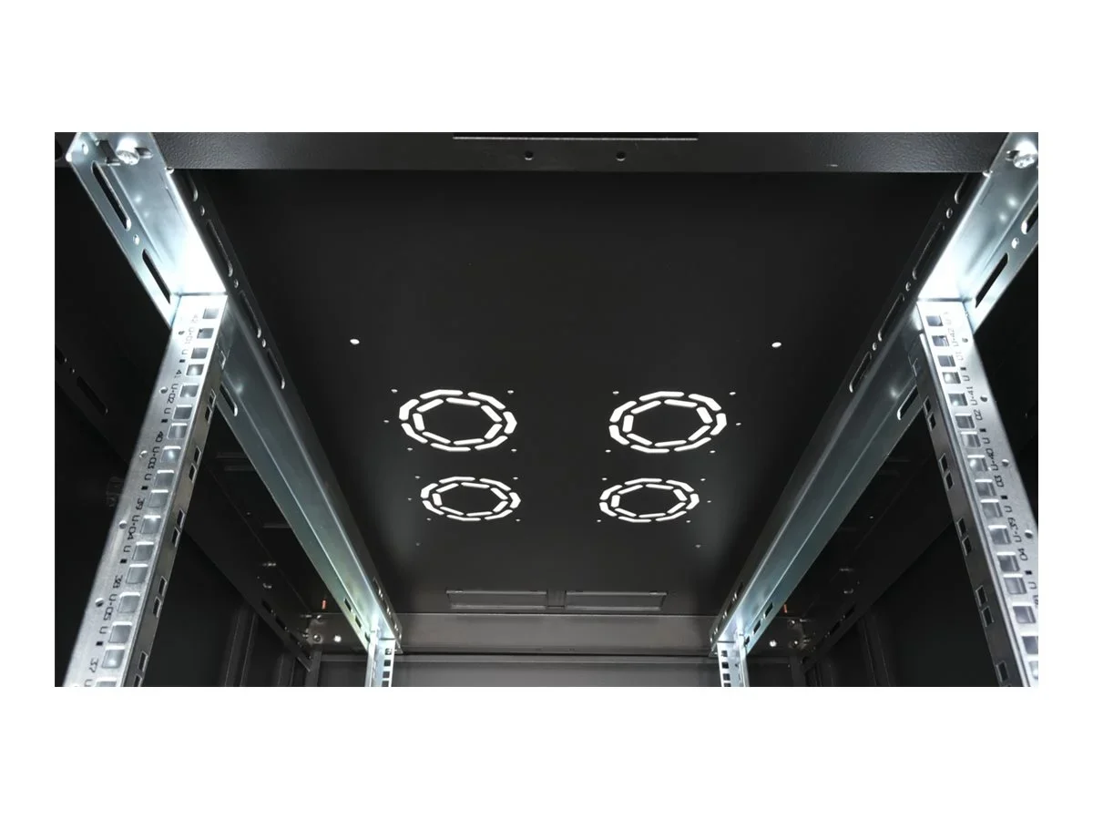 ROLINE 19 Zoll Serverschrank Basic 42 HE 800x1000 BxT perforiert schwarzDie Netzwerkschränke der ROLINE Basic Serie wurden entwickelt, um einen einfachen und besonders kosteneffizienten Netzwerkausbau zu ermöglichen. Durch strategisch platzierte Kabeleinlässe ist eine mühelose Installation je nach Anwendungsfall gewährleistet. Im Bodenchassis befindet sich der Kabeleinlass, der durch eine verschraubte Abdeckplatte geschützt und im hinteren mittigen Bereich positioniert ist. Bei Schränken ab 800 mm Breite werden zusätzliche Kabeleinlässe mit Kunststoffabdeckung links und rechts hinzugefügt. Diese sind auch im Dach integriert (einmal bei 600 mm Schrankbreite, dreimal bei 800 mm Schrankbreite). Für die Installation eines Lüftermoduls ist das Dachchassis ebenfalls mit einem ausgestanzten Bereich versehen. Im Inneren sind zwei Paar galvanisierte 19"-Profilschienen verbaut, die in beide Richtungen ablesbar sind und sich in der Tiefe verstellen lassen. Sie sind zudem mit zusätzlichen Tiefenstreben im Schrank verbunden. Jeder Schrank besteht aus einer robusten Stahlkonstruktion mit einer Materialstärke von bis zu 1,5 mm Stahlblech.Die Farbgebung erfolgt mittels elektrostatischer Pulverbeschichtung in den Standardfarben Grau (RAL 7035) und Schwarz (RAL 9005). Abnehmbare Seiten- und Rückwände sowie eine abschließ- und abnehmbare Fronttür verbessern die Zugänglichkeit. Ein Wechsel des Türanschlags ist möglich. Zudem sind die Schränke aufgrund ihrer zerlegbaren Konstruktion bei Bedarf vollständig demontierbar.