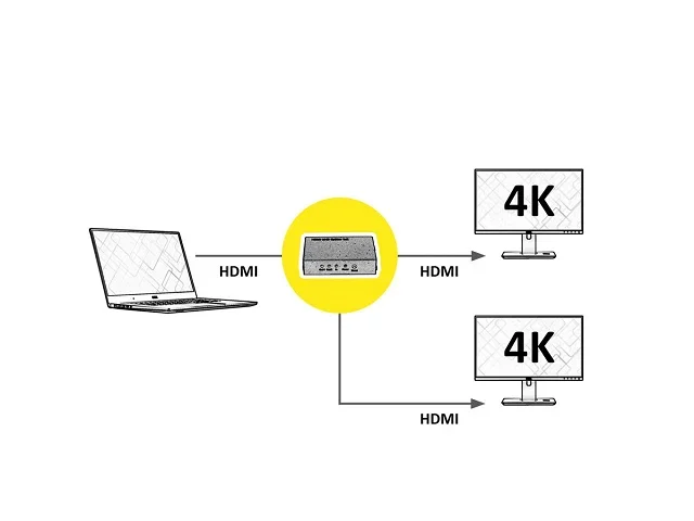 Vervielfältigt ein HDMI Videosignal, z.B. von einem DVD-Player, auf bis zu zwei Ausgabegeräte mit 4K-Auflösung (bei 60 Hz) Für den Einsatz bei Präsentationen bzw. zu Schulungszwecken Anschlüsse: 1x HDMI Eingang, 2 HDMI Ausgänge Unterstützt 480i, 480p, 720i, 720p, 1080i, 1080p, 2160p @60Hz Unterstützt 3D Einfache Installation und Bedienung Es wird keine Software benötigt Spannungsversorgung 5VDC, 2AROLINE 2-Port HDMI-Splitter für Bildübertragungen bis zu 4K2K Ultra HD und in 3D-QualitätDer ROLINE HDMI-Video-Splitter ermöglicht eine zuverlässige Aufteilung von Bild- und Tonsignalen an bis zu zwei HDMI-Anzeigegeräte ohne jegliche Qualitätsverluste. So können beispielsweise Videoformate von PC oder Notebook auf zwei Endgeräte wie Monitor, Fernseher oder Projektor verteilt werden. Ein Netzadapter für die Stromversorgung ist im Lieferumfang inbegriffen. Das hochwertige Metallgehäuse verbessert die Schirmung der Signale und sorgt für einen absolut störungsfreien Datentransfer. Der ROLINE HDMI-Splitter eignet sich insbesondere für den professionellen Gebrauch, z.B. für Schulungszwecke oder in der Werbung, die in hoher Auflösung mit bis zu 4k erfolgen soll. Es wird keine Software benötigt.