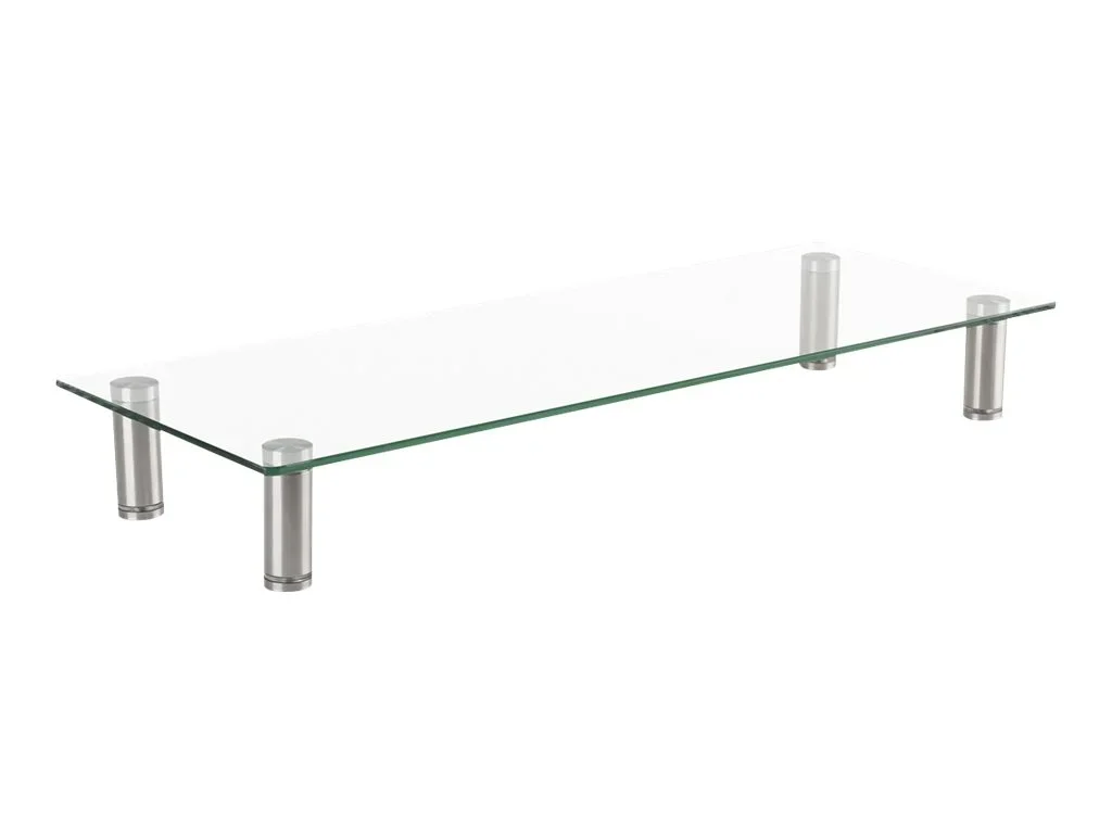 Hochwertiger, höhenverstellbarer Glastisch. In den ausgeklügelten Metallfüßen befindet sich ein Gewinde, mit dem der Glastisch perfekt für die jeweilige Oberfläche justiert werden kann.