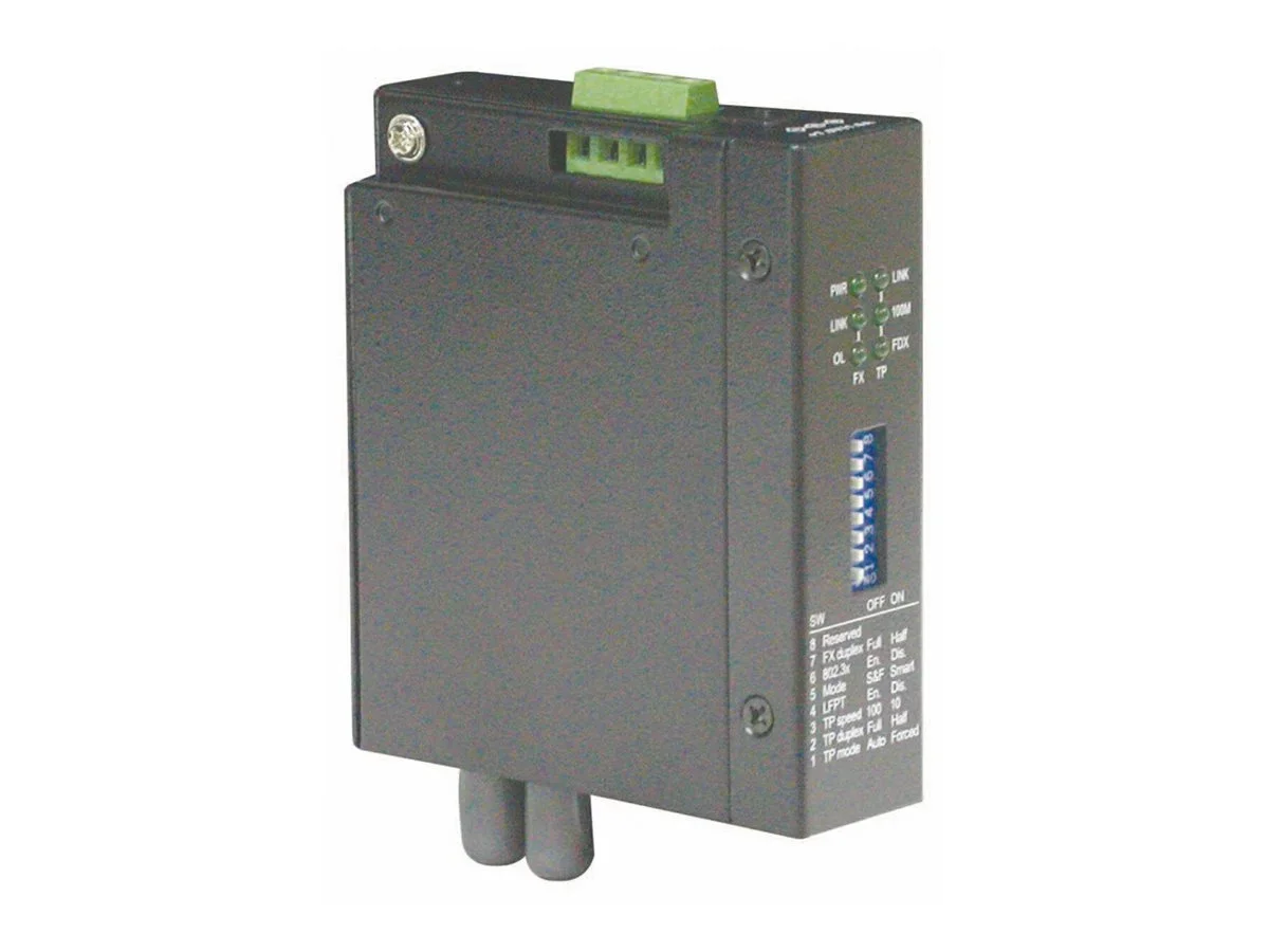 Netzwerk-Konverter für den Einsatz in Industrieumgebungen Full Wire Speed Umwandlung des Fast Ethernet Signals Auto-Negotiation 10/100Mbps oder feste Einstellung am Kupferport Auto MDI/MDI-X Link Fault Pass Through Funktion Zahlreiche Konfigurationsmöglichkeiten Transparente Umwandlung der 802.1Q VLAN Pakete geringer Strombedarf DIN Hutschienenmontage Betriebsspannung: +7 bis +30VDC : 2,6W (max.) Betriebstemperaturbereich: - 10 °C - +70 °C Eingang DC über Klemmenblock oder DC-Hohlstecker (6,3mm/2,0mm) Als passendes Netzteil empfehlen wir das Hutschienen-Netzteil NDR-75-24 (21.13.1311).