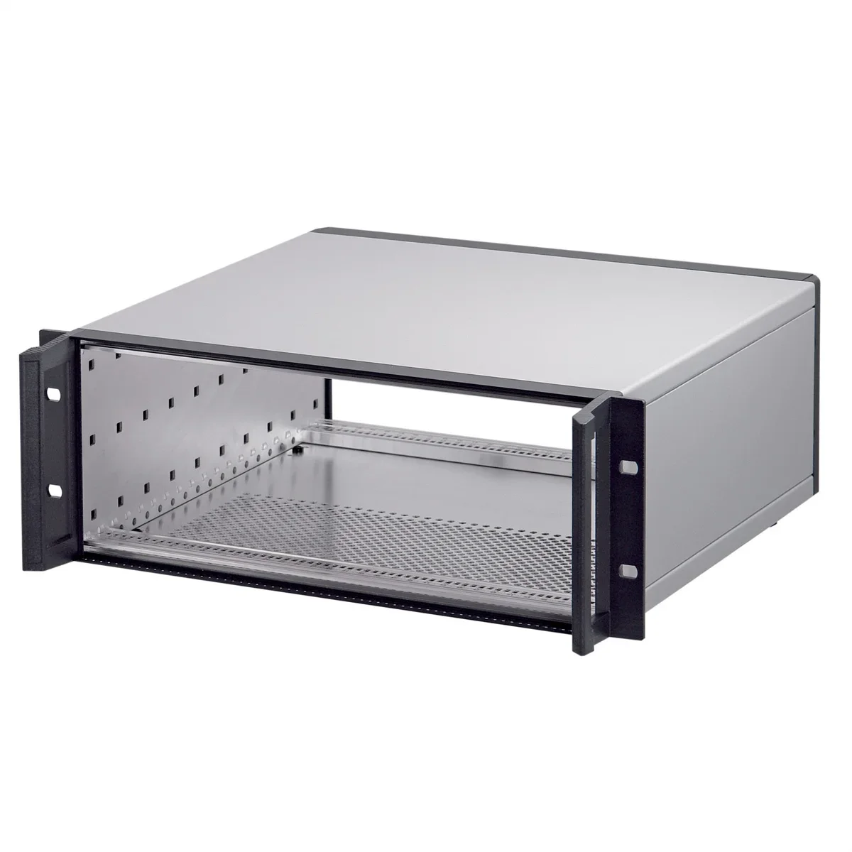 Flexibles und robustes Gehäuse für 19"-Komponenten oder Elektronikbaugruppen. Gehäuse zum individuellen Ausbau mit 19-Zoll-Norm- Komponenten oder spezifischem Innenausbau, z.B. mit Montageplatte. Entwickelt für Einführungs-/Extraktionsgriffe gemäß IEC 60297-3-102 und IEEE 1101.10 für CompactPCI- und VME64x Anwendungen. Ausführung mit 19-Zoll-Montagewinkel mit Frontgriffen. EMV-Schirmung nachrüstbar