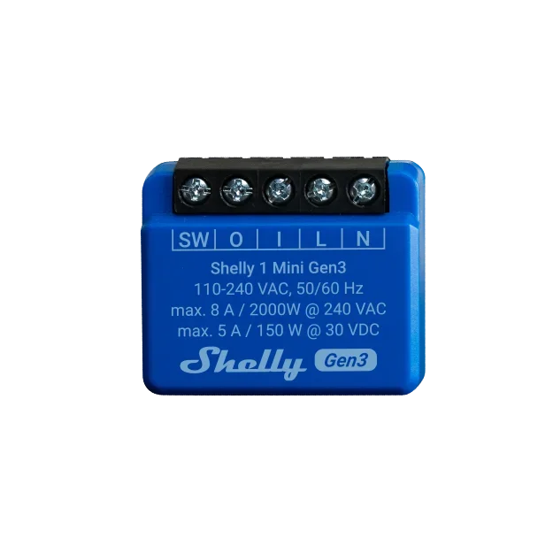 Wlan-gesteuerter intelligenter Schalter, 1 Kanal 8 A Das kleinste Schaltrelais der Welt für intelligente Steuerung. Automatisieren Sie Ihre Beleuchtung, Ihr Garagentor, Ihre Bewässerungsanlage oder andere kleine Elektrogeräte in weniger als 10 Minuten und steuern Sie sie von überall aus. Shelly 1 Mini Gen3 ist klein genug, um hinter jedem Wandschalter oder jeder Steckdose Platz zu finden, ist nachrüstbar und hochgradig kompatibel mit Ihrem bestehenden intelligenten Systemen. Ausgestattet mit einem neuen Prozessor und einem größeren Flash-Speicher - ESP Shelly Verbesserte Stabilität der Terminals Unterstützt bis zu 8 A bei 240 VAC und 5 A bei 30 VDC Trockene Kontakte (potentialfrei) WLAN Reichweiten Extender & Bluetooth Gateway kein Hub erforderlich! Einfache Steuerung über die Shelly Smart Control App, die meisten Plattformen und Protokolle sowie über Sprachassistenten. Verwenden Sie es mit Alexa, Home Assistant oder Ihrem bevorzugten Automatisierungssystem. Unterstützt Scripting, Webhooks, MQTT, WebSocket, HTTPS, UDP, TLS und benutzerdefinierte Zertifikate Mini-Größe, Mini-Preis Diese Mini-Relais wurden mit Blick auf Benutzerfreundlichkeit gestaltet und beinhalten alle Funktionen herkömmlicher Schalter in einem kompakten und platzsparenden Design. Ausgestattet mit unserem leistungsstarken Shelly-Chip mit 8 MB Speicher werden die Effizienz und die Reaktionsfähigkeit des Geräts deutlich verbessert, was einen reibungslosen und schnellen Betrieb garantiert. Trotz ihrer geringen Größe gehen die Shelly Mini Gen3-Geräte keine Kompromisse bei Leistung und Funktionalität ein. Auf die Größe kommt es an Shelly Mini Gen3-Geräte eröffnen eine Welt der Möglichkeiten, denn sie lassen sich selbst in den engsten Räumen und Schaltkästen nahtlos integrieren. Funktionen WLAN betrieben Verbinden Sie Shelly 1 Mini Gen3 mit Ihrem Wlan-Netzwerk. Kein HUB erforderlich! Bluetooth-Einbindung Fügen Sie Geräte schnell und einfach über Bluetooth hinzu oder verwenden Sie ihn als Bluetooth-Gateway. Trockene Kontakte Verwenden Sie es, um eine Vielzahl von Geräten und Apparaten zu steuern. Intelligente Zeitpläne Sie benutzerdefinierte Zeitpläne auf der Grundlage Ihrer täglichen Agenda fest oder folgen Sie dem Sonnenaufgang/Sonnenuntergang und steuern Sie Ihre Beleuchtung entsprechend. Intelligente Szenen Stellen Sie benutzerdefinierte Szenen ein, indem Sie Shelly 1 Mini Gen3 mit Ihren anderen Shelly Geräten kombinieren. Skripting Shelly 1 Mini Gen3 unterstützt mjS-Skripte, mit denen Sie eigene Funktionen erstellen können Anwendungsbeispiel Lichtsteuerung, wo immer Sie sie brauchen Dank seiner kompakten Größe passt Shelly 1 Mini Gen3 unauffällig in den Deckenbaldachin Ihrer Lampe oder in überfüllte Steckdosen. Einmal installiert, können Sie mit Shelly 1 Mini Gen3 Ihre Beleuchtung mühelos über die Smart Control App, Ihre bevorzugte Plattform oder einen Sprachassistenten steuern. Passen Sie Ihre Beleuchtung mit personalisierten Zeitplänen ganz einfach an Ihren Tagesablauf an und sparen Sie Energie. Stellen Sie Ihre Flurbeleuchtung so ein, dass sie sich automatisch nach der Schlafenszeit Ihrer Familie ausschaltet, um eine ruhige Nachtruhe zu gewährleisten. Und keine Sorge - Sie können Ihre Lichtschalter immer noch manuell bedienen, um die Bedürfnisse aller Bewohner Ihres Hauses zu erfüllen. Jedes kleine Elektrogerät intelligent machen Die Umwandlung alter Elektrogeräte in intelligente Geräte wird mit Shelly 1 Mini Gen3 noch einfacher. Sein 8A-Limit ist perfekt, um kleine bis mittelgroße Geräte wie Lampen, Kaffeemaschinen und andere in intelligente Geräte zu verwandeln. Sie können ihn in die Steckdose bauen oder unauffällig in das Gehäuse des Geräts einbauen, so dass keine zusätzliche externe Verkabelung erforderlich ist. Außerdem können Sie Shelly Mini 1 Gen3 mit einem Schütz verwenden und größere Geräte steuern. Steuern Sie Ihr Garagentor Das kompakte Design des Shelly 1 Mini Gen3 ermöglicht eine flexible Platzierung, so dass Sie ihn direkt im Gehäuse des Garagentoröffners oder sogar in der Nähe des Motors installieren können. Seine 8A Belastbarkeit sorgt für eine zuverlässige Garagentorsteuerung, so dass Sie Ihr Garagentor bequem aus der Ferne bedienen können, ohne sperrige externe Module zu benötigen. Automatisieren Sie Ihr Bewässerungssystem in Abhängigkeit vom Wetter Der Shelly 1 Mini Gen3 kann aufgrund seiner geringen Größe in der Nähe der Schalttafel des Bewässerungssystems oder in einem wasserdichten Gehäuse installiert werden und bietet so Schutz vor den Elementen. Seine 8A-Kapazität eignet sich perfekt für die Steuerung von Bewässerungsventilen, die nahtlose Automatisierung und die witterungsabhängige Wassereinsparung durch die Nutzung seiner Skriptfunktionen. SMART-HOME STEUERUNG IN PERFEKTION Shelly Smart Control Shelly Smart Control - Eine App zur Kontrolle Ihrer Räume, Ihres Energieverbrauchs und Ihrer Ausgaben. Passen Sie Ihre Dashboards an, erhalten Sie detaillierte Verbrauchsberichte und behalten Sie den Überblick über Ihre Stromrechnungen. Volle Kompatibilität Shelly-Geräte sind mit Alexa, Google Home, Android und iOS kompatibel. Zusammen mit dem Sprachassistenten können Sie Shelly-Geräte mit Ihrer Stimme steuern! Technische Daten Größe (HxBxT): 29x34x16 ±0.5 / 1.34x1.11x0.63 in Umgebungstemperatur: -20 °C bis 40 °C / -5 °F bis 105 °F Luftfeuchtigkeit: 30 % bis 70 % RH Max. Höhe ü.M.: 2000m / 6562 ft Spannungsversorgung: 110 - 240 VAC, 50/60Hz Elektrischer Verbrauch: < 1,2 W Maximale Schaltspannung AC: 240 V Maximale Schaltspannung DC: 30 V Maximaler Schaltstrom AC: 8 A Maximaler Schaltstrom DC 5 A Potentialfreie Kontakte Ja Frequenzband: 2400 - 2495 MHz Max. Sendeleistung in Frequenzband: <20 dBm WLAN Protokoll: 802.11 b/g/n WLAN Reichweite (abhängig von den örtlichen Gegebenheiten): bis zu 50 m / 160 ft im Freien bis zu 30 m / 100 ft in Innenräumen Bluetooth Protokoll: 4,2 Bluetooth-Reichweite (abh