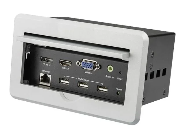 Diese Konnektivitätsbox für Konferenztische ermöglicht A/V-Installationen im Konferenztisch oder Rednerpult zur Bereitstellung von A/V-, Netzwerk- und USB-Ladeanschlüssen in Ihrem Konferenzraum, Auditorium oder Klassenzimmer. Das Gehäuse erleichtert das Anschließen von Laptops mit HDMI-, DisplayPort- und VGA-Anschlüssen an das große HDMI-Display im Raum und bietet LAN- und USB-Anschlüsse zum Laden von USB-Geräten. Die Box bietet auch Kabelmanagement für den Konferenzraum, da Anschlusskabel im Tisch untergebracht werden können.