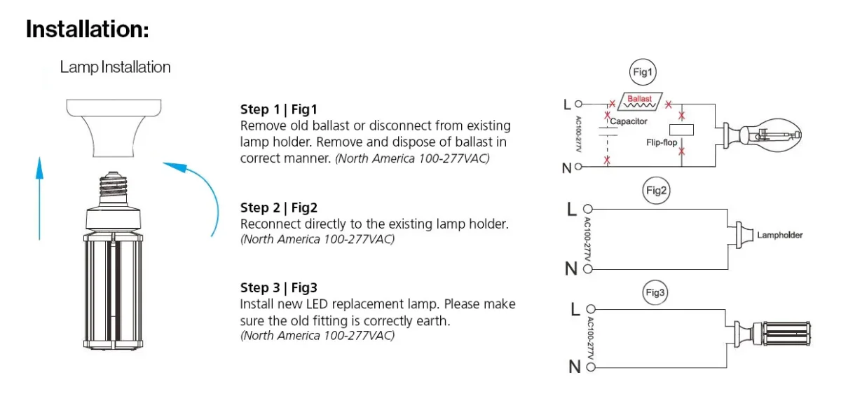 E40 Gewinde-Sockel (E27 auf Anfrage verfügbar) Ersatz für 250W HPS / MHL LED: 256*SMD2835 (Samsung) Farbe: neutralweiss, andere Lichtfarben sind auf Anfrage verfügbar. Kelvin: 4000K CRI: >80 Abstrahlwinkel: 360° und Sockel Drehbar um 350° Wattage (W): 54 Lumen (Lm) : 8100 Abdeckung: milchig Dimmbar: nein Voltage (V): 100-277VAC, 50/60Hz Durchmesser: 85 mm Gesamtlänge: 253 mm Schutzklasse: IP64 Betriebstemperatur: -40°~+60°C Energieeffizienzklasse: A+ kWh/1000h: 54
