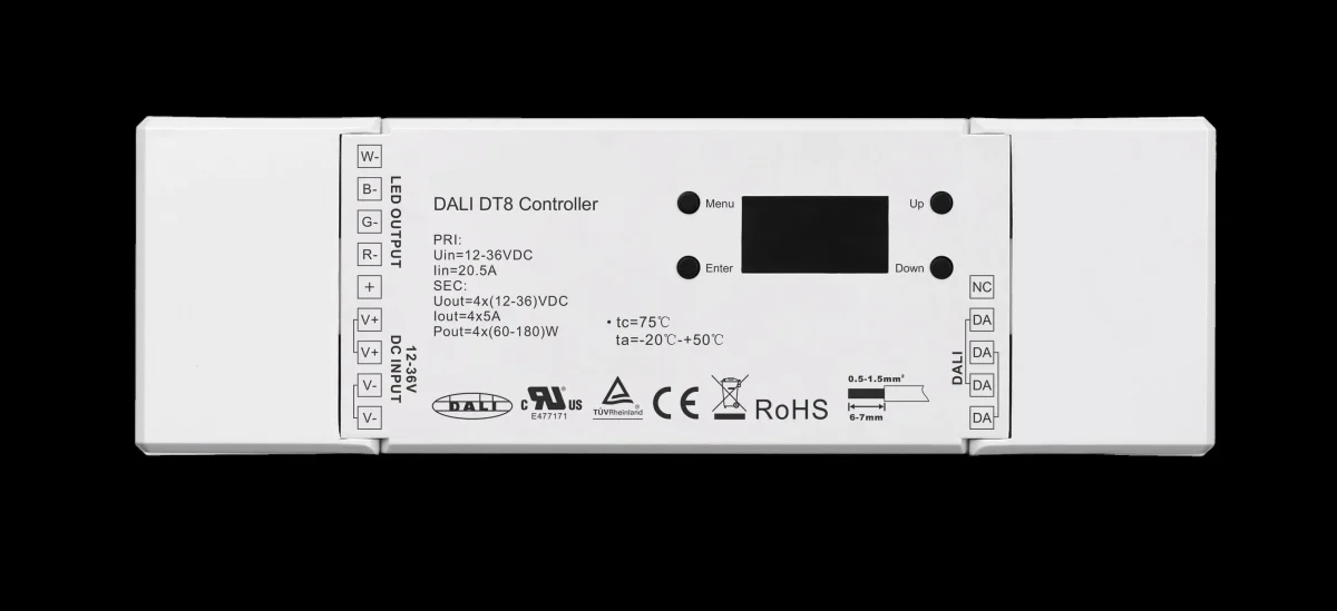 DALI-OLED-Controller Der DALI-OLED-Controller ist der weltweit erste DALI-zertifizierte DT8-Dimmer mit integrierter DALI-Master-Funktion und OLED-Display für eine sichtbare manuelle Konfiguration. Der LED-Dimmer ist mit vier PWM-Ausgängen ausgestattet, die über eine einzige DALI-Adresse gesteuert werden. Alle DT8-Farbtypen sind in einem Gerät vereint: Tc, RGBWA, XY+Tc, RGB+Tc können eingestellt werden. Zudem ermöglicht der Dimmer die Adressierung (00-63) und Gruppierung (0-15). Es können insgesamt 16 DALI-Szenen voreingestellt und abgerufen werden. Die PWM-Ausgangsfrequenz ist von 250 Hz bis 30 kHz einstellbar, um eine besonders sanfte Farbanpassung zu gewährleisten. Der Dimmer erlaubt die Festlegung eines minimalen Dimmniveaus zwischen diesem Wert und dem maximalen Wert. Ausgangspegel und DT8-Farbe können manuell eingestellt werden. Zudem lassen sich DALI-Standardparameter wie Fade-Zeit, Fade-Rate, Einschaltpegel und Systemfehlerpegel konfigurieren. Hauptmerkmale DALI-zertifiziert TÜV CE-zertifiziert DALI-zertifizierter DT8-Dimmer mit 4-Kanal-PWM-Ausgang OLED-Display-Schnittstelle für einfache und schnelle Installation Entspricht dem neuesten IEC 62386-209:2011-Standard Weltweit erstes DALI-Gerät mit integrierter DALI-Master-Funktion Kein externer DALI-Master erforderlich Kostengünstiger und zeitsparender als DALI-USB-Konfiguration Ermöglicht Adressierung und Gruppierung Unterstützung von bis zu 16 vordefinierten und abrufbaren DALI-Szenen PWM-Frequenz bis zu 30 kHz einstellbar für besonders sanfte Farbsteuerung Alle DT8-Farbtypen in einem Gerät: Tc, RGBWA, XY+Tc, RGB+Tc einstellbar Festlegung eines minimalen Dimmniveaus innerhalb des Dimmbereichs möglich Manuelle Einstellung des Ausgangspegels und DT8-Farbsteuerung Konfiguration von Fade-Zeit, Einschaltpegel und Systemfehlerpegel Kompatibel mit DALI-Systemen von Osram, Philips, Tridonic, Helvar, Lutron usw.