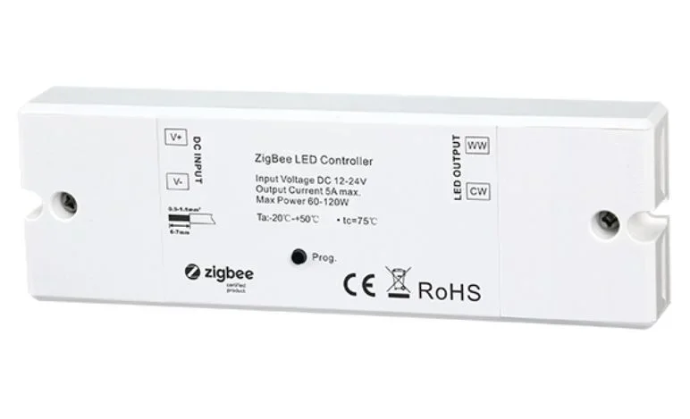 Synergy 21 LED Controller EOS 10 Zigbee 2-Kanal Controller CCT (2 wires) Der Synergy 21 LED Controller EOS 10 ist ein leistungsstarker Zigbee-Controller zur Steuerung von 2-adrigen CCT-LED-Streifen. Er ist nicht für 3-adrige CCT-LED-Streifen geeignet. Der Controller ermöglicht eine flexible Steuerung von Ein-/Ausschalten, Helligkeit und Farbtemperatur (CCT) über ein Zigbee-Netzwerk. Eigenschaften: Zigbee 3.0 kompatibel – hohe Interoperabilität mit Zigbee-Systemen und Smart-Home-Plattformen. 2-Kanal-Steuerung – ermöglicht präzise Anpassung der Farbtemperatur (Warmweiß/Kaltweiß). Kabelloses Zigbee-Netzwerk – Steuerung über Zigbee-Hubs, Gateways und kompatible Fernbedienungen. Direkte Koppelung (Touchlink) – direkte Verbindung mit Zigbee-Fernbedienungen ohne Gateway möglich. Selbstformendes Zigbee-Netzwerk – ohne Koordinator möglich. Zigbee Green Power-Unterstützung – bis zu 20 Zigbee Green Power-Fernbedienungen direkt verbindbar. Einfache Adressierung – Geräte können über " Find & Bind"-Modus zugeordnet werden. OTA-Updatefähig – automatische Firmware-Updates über das Zigbee-Netzwerk. Eingebauter Programmiertaster – für einfaches Pairing und Zurücksetzen. Sicherheit & Schutz – Schutzklasse IP20 (für den Innenbereich). Technische Daten: Eingangsspannung: 12-24V DC (Konstantspannung) Maximale Ausgangsleistung: 60-120W (abhängig von der Eingangsspannung) Maximaler Ausgangsstrom: 5A Anschlüsse: 2-adrige Klemmen für CCT-LED-Streifen (nicht für 3-adrige CCT-LED-Streifen geeignet) Abmessungen: 145 × 46,5 × 16 mm Schutzklasse: IP20 (nur für Innenräume geeignet) Anwendungsbereiche: Smarte Beleuchtungssteuerung für Wohn- und Geschäftsräume Integration in Smart-Home-Systeme Lichtsteuerung über Zigbee-Fernbedienungen oder Apps Hinweis: Der Controller darf nicht mit Strom betrieben werden, während er installiert oder verkabelt wird.