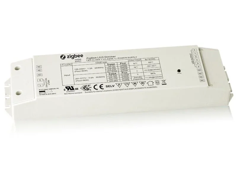 Zigbee Controller + Netzteil in einem Kompatibel zu: Echo Plus speaker, Echo Show, Philips Hue, IKEA TRÅDFR, Homey, OSRAM LIGHTIFY Gateway.....ect Dimming Input: Zigbee Dimming Output: PWM Dimming Range: 0-100% Intput Voltage: 100-277V AC Power Factor: >0,98 Efficiency: >90% Output Voltage: 24V Output Current: 4A max./CH, 1CH+2CH+3CH+4CH=3A Outpout Power: 100W max Output Channel: 4, RGBW