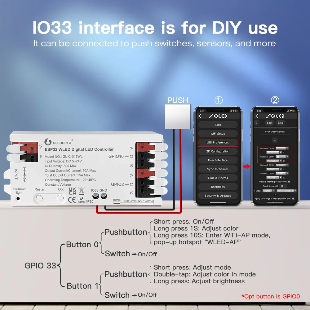 EOS WLED Controller Serie passend für WLED App Mehr informationen zu WLED siehe auch https://kno.wled.ge/ ESP32 Controller Synerg 21 Pixel LED Streifen ESP32 WLED Digital LED Controller, DC5~24V, max 15A total output, max 10A per channel max 800 ICs connected, works with SM16703P, SK6812, WS2811, WS2812B, FL19038, etc. - DIY lighting effects 100+ - Segmentally control lighting color and effects - Connected to local network or Internet optional - Works with RGB, RGBW digital strip light - Night light function available