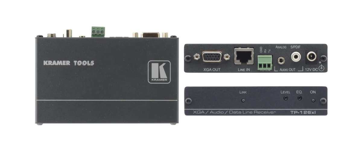 TP−126xl ist ein Twisted Pair Empfänger für Computergrafik−Video, unsymmetrisches Stereo−Audio sowie bidirektionale RS−232 Steuerbefehle mit vergrößerter Reichweite. Das Gerät erhält das Twisted Pair Signale vom Übertrager TP−125xl und wandelt dieses zurück in Computergrafik, RS−232, unsymmetrisches Stereo und S/PDIF−Audio.