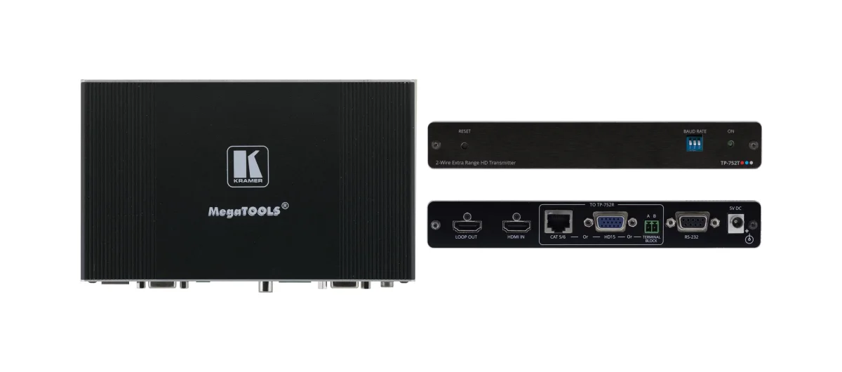 TP−752T ist ein Hochleistungssender für die Erweiterung von 1080p (HD) −HDMI−Signalen über Entfernungen von bis zu 600 m (2000 ft) mit jeder 2−Draht−Verkabelung. 575 unterstützt diverse Verkabelungs− und Anschlussoptionen für typische Installationen