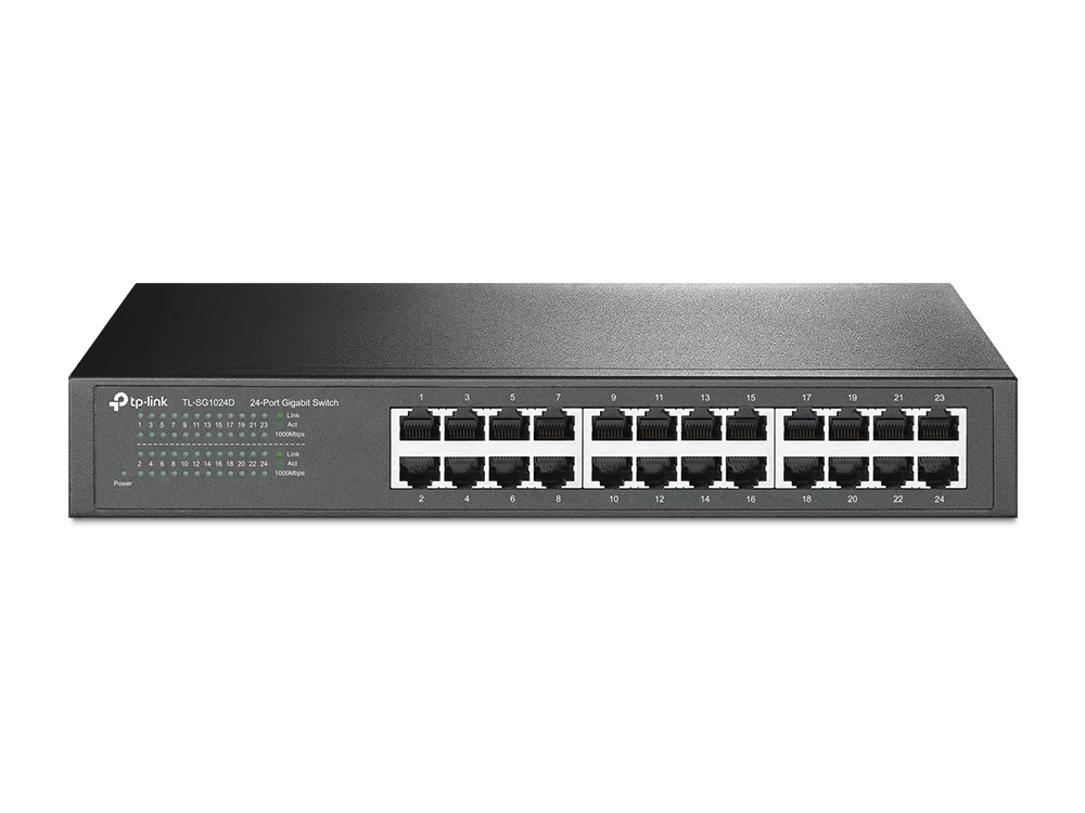 TP-Link TL-SG1024D. Switch-Typ: Unmanaged. Basic Switching RJ-45 Ethernet Ports-Typ: Gigabit Ethernet (10/100/1000), Anzahl der basisschaltenden RJ-45 Ethernet Ports: 24. Vollduplex. MAC-Adressentabelle: 8000 Eintragungen, Routing-/Switching-Kapazität: 48 Gbit/s. Netzstandard: IEEE 802.3ab, IEEE 802.3u, IEEE 802.3x. Netzstecker: DC-Anschluss. Rack-Einbau
