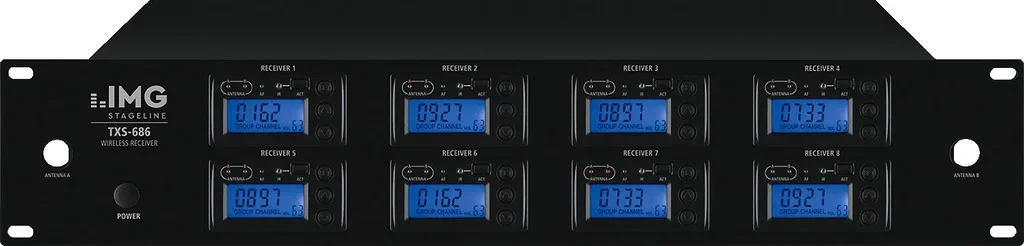 - LCD-Anzeige für Gruppe/Kanal, HF-Empfangslevel, NF-Audio-Level und zusätzliche LED-Anzeige für Antenne A/B, Audio-Signal pro Kanal