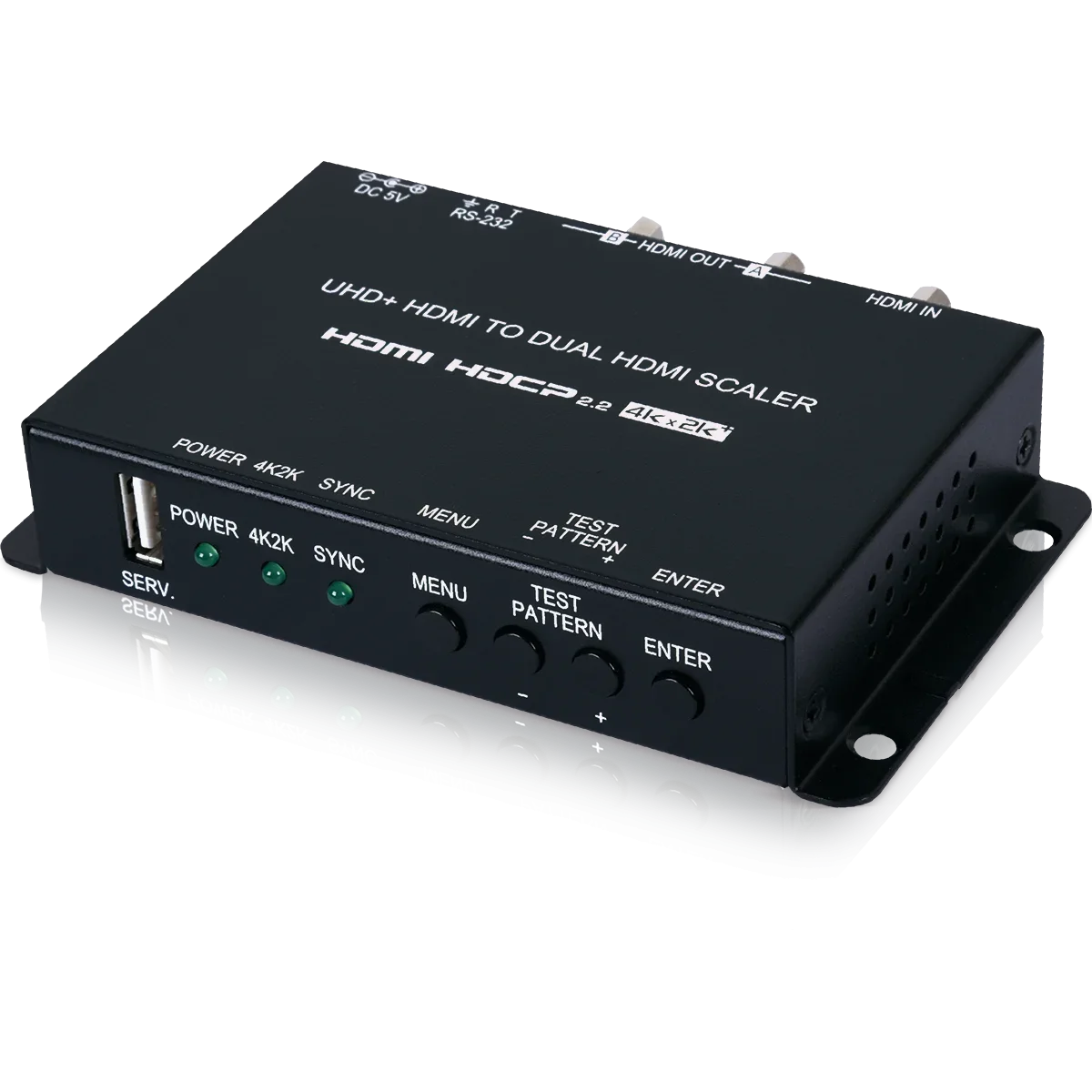 HDMI signal bypass on both outputs or upscales 1080p signals to 4K on output B and downscales 4K signals to 1080p on output A , Supports 4K HDR at 24/30Hz (YUV 4:4:4) and 50/60Hz (YUV 4:2:0) with up to 12- bit color , Supports 16-bit Deep Color up to 1080p@60Hz , Supports pass-through of many audio formats including LPCM 2.0/5.1/7.1, Bitstream, and HD Bitstream , Integrated EDID and HDCP management , Basic signal event automation (via RS-232 or CEC) , Test pattern generation at selected resolutions for on-site display testing , Controllable via front panel with OSD menu, and RS-232