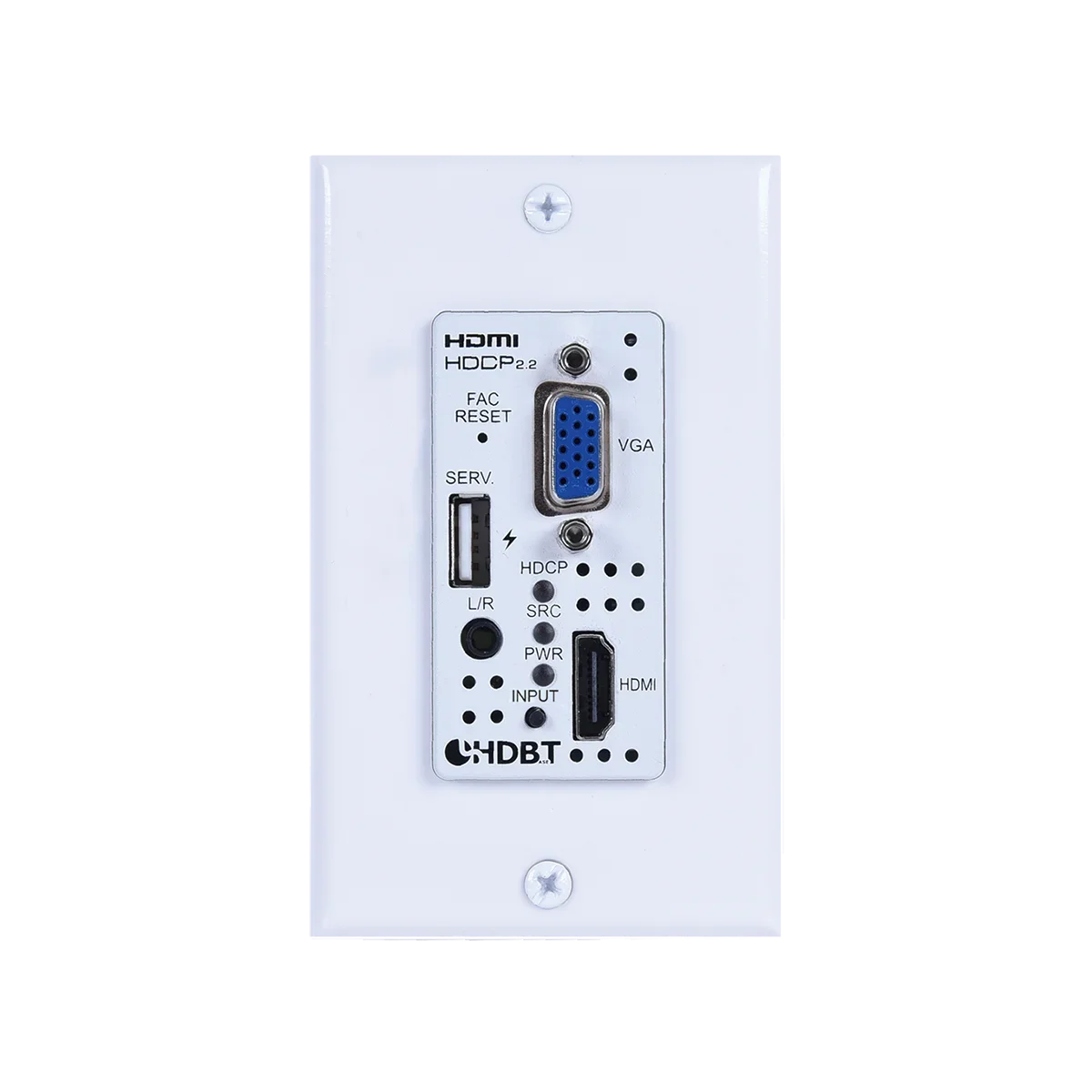 Wall plate is designed for US one-gang sized enclosures, Supports CEC bypass and User activated information OSD, Unit may be powered locally or via 48V PoH from a compatible HDBaseT Receiver (PSE), Supports manual input selection or automatic input selection with hot plug detection, Basic signal event automation (via RS-232 or CEC w/ compatible Receiver, USB port supports firmware update and powering of 5V/500mA devices, Controllable via a multi-function front panel button with OSD, or via WebGUI, Telnet, and RS-232 (w/ compatible Receiver only)