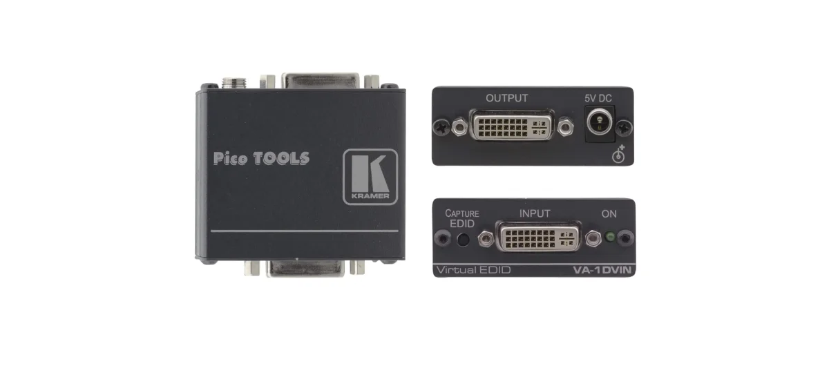 VA−1DVIN ist ein EDID−Emulator für DVI−D Signale. Das Gerät kann einen EDID−Vorgabewert eines Anzeigegerätes vom Ausgang erfassen und im nichtflüchtigen Speicher ablegen. Dies gestattet einen einfachen und verlässlichen Verbindungsaufbau mit der Signalquelle.